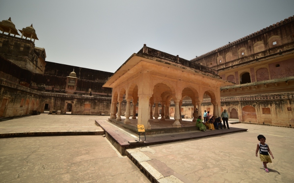 Au centre de la cour se dresse un élégant pavillon à colonnes où quelques grappes d’Indiens s’abritent du soleil. Celui-ci était jadis tendu de draperies et accueillait les conciliabules des douze favorites du maharaja ! Trois reines en titre, trois reines de cœur, trois reines du milieu et trois petites reines… Sans compter les quelque 300 concubines du maharaja qui vivaient, elles, à l’extérieur du palais !