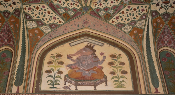 Avant de pénétrer dans la grande cour du maharaja, je lève encore la tête vers le sommet de la Ganesh Pol. Il faut imaginer toutes les femmes du harem qui se précipitaient là pour jeter des fleurs au maharaja quand il rentrait à la maison.