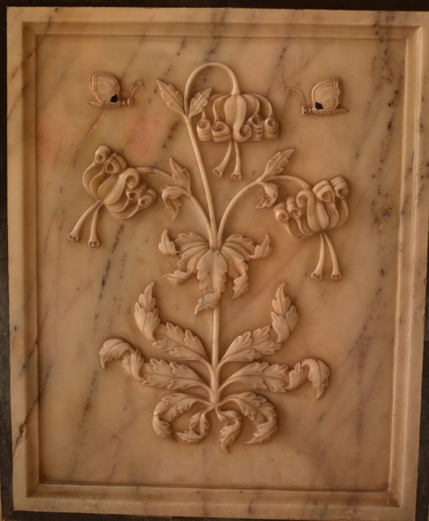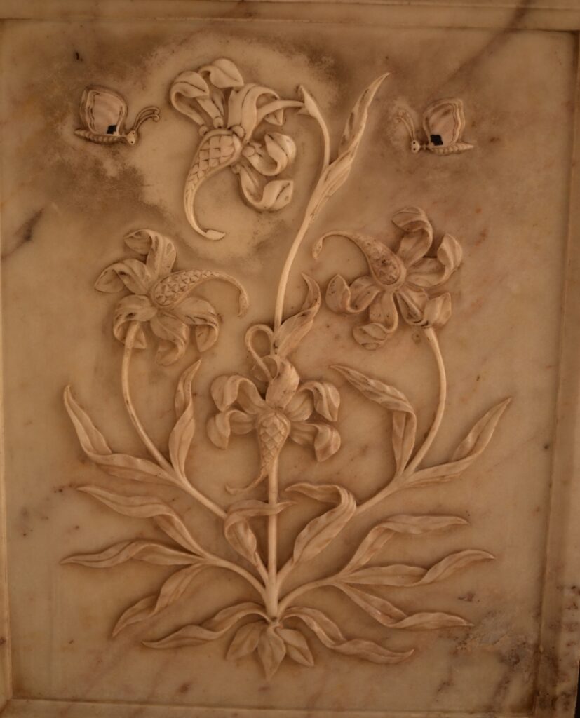 Sous les arcades justement, dans la longueur du bâtiment, une succession d’arches aux stucs peints, ouvragés de motifs floraux, et recouverts de miroirs. Un style emprunté aux Moghols et aux Perses.