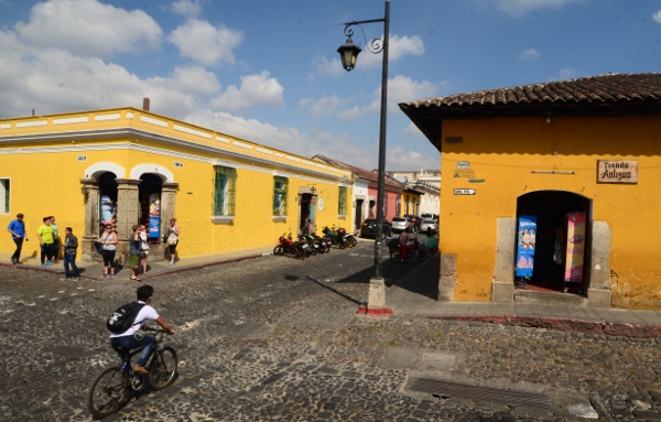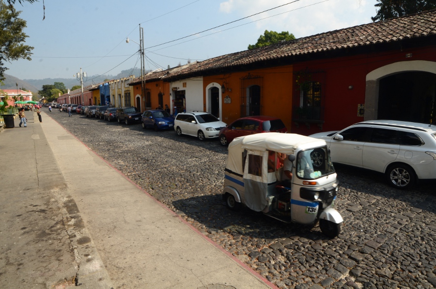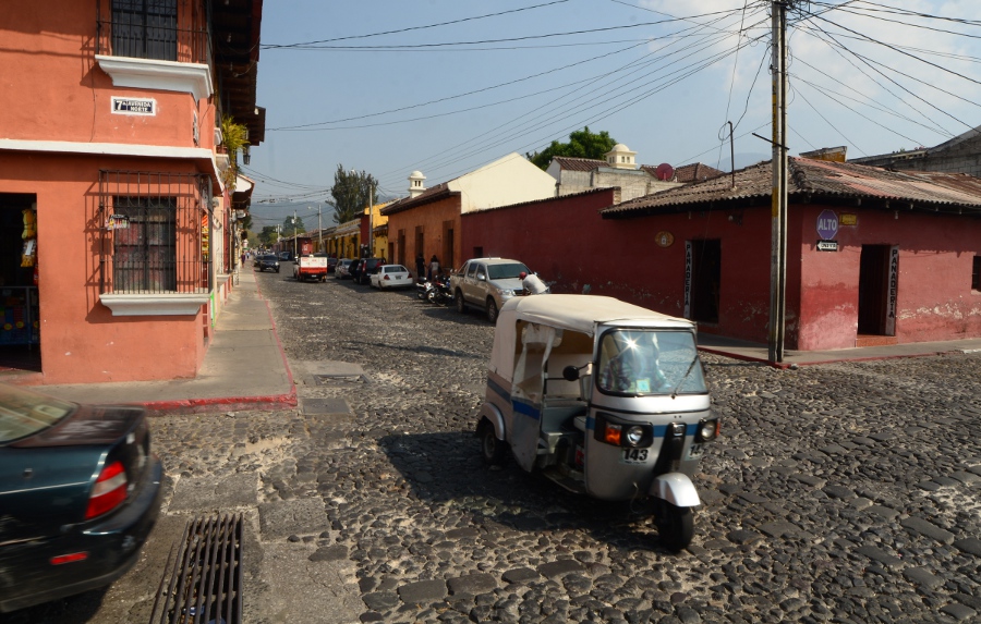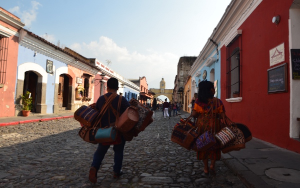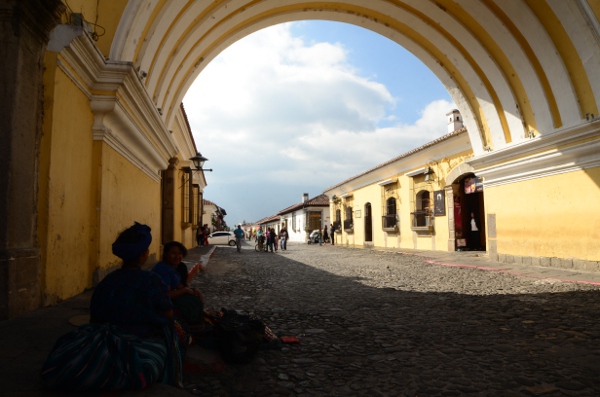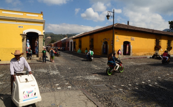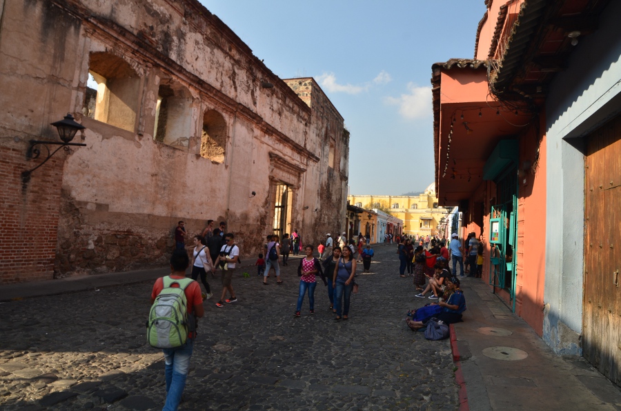 Antigua la belle. Antigua l’insaisissable. Les ruines côtoient les branches des arbres tropicaux, les Indiens traversent la ville chargés de fripes, de sacs et de tapis à la recherche de quelques quetzales, les monuments se parent de fenêtres orphelines, les tuk-tuks bringuebalent sur les pavés, les enfants jouent, les mères se protègent du soleil et les hommes relèvent les yeux au ciel. Les filles se pressent contre leur père. La police veille et les marchands ambulants dressent leurs étals. Les rues d’Antigua débordent d’une vie simple et rude que les couleurs de la ville encadrent comme des tableaux.