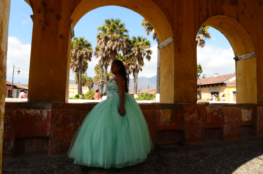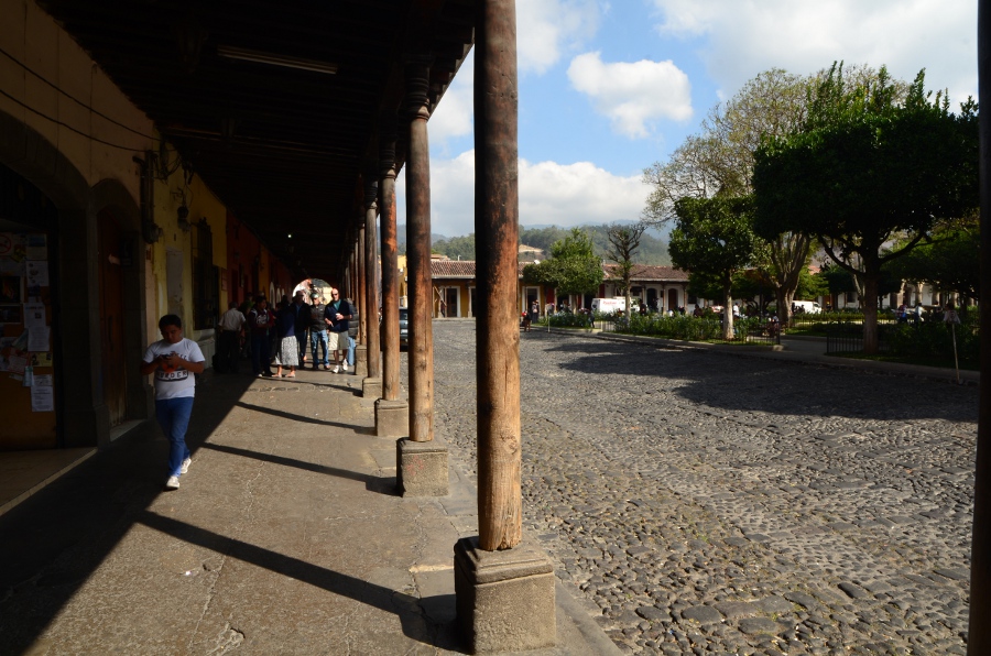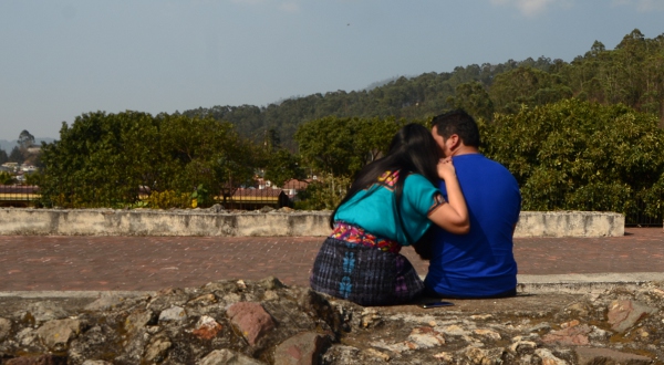 Se promener au hasard dans les rues d’Antigua est une des plus belles choses qui me soit arrivée au cours de mes voyages. Les surprises surgissent de chaque coin de rue. La nostalgie des ruines s’entremêle avec l’envie de vivre et d’affronter les éléments, la misère et la peur, le risque voir l’un des trois volcans qui surplombent la ville, exploser à tout moment, tout engloutir. Un couple s’enlace. J’aime ces moments.