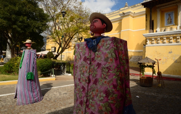 Je continue ma flânerie à travers les rues colorées et bariolées d’Antigua qui se pare, de jaune, d’ocre, de vert ou de bleu pour attirer l’attention sur elle. Ici du côté de la Iglesia de la Merced où de drôles de personnages se dressent sur le parvis de l’église.