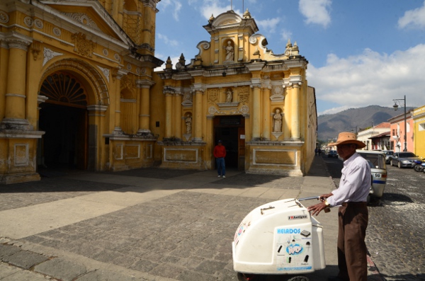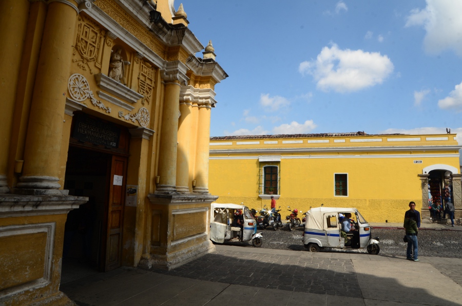Plus loin, une église à la façade jaune, épargnée par les séismes, fait face au couvent Santa Clara. Un homme tourne la manivelle de sa boîte à musique.