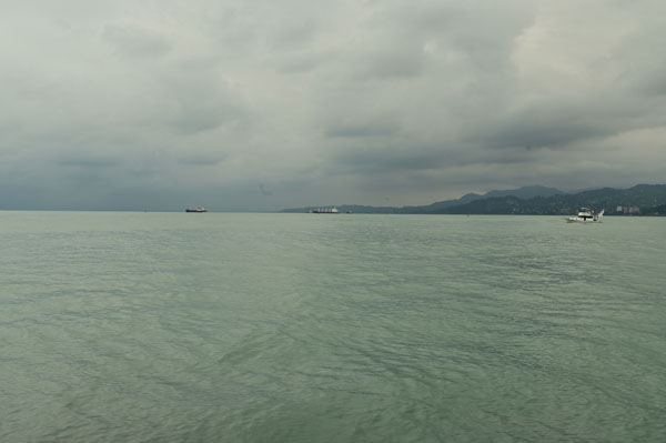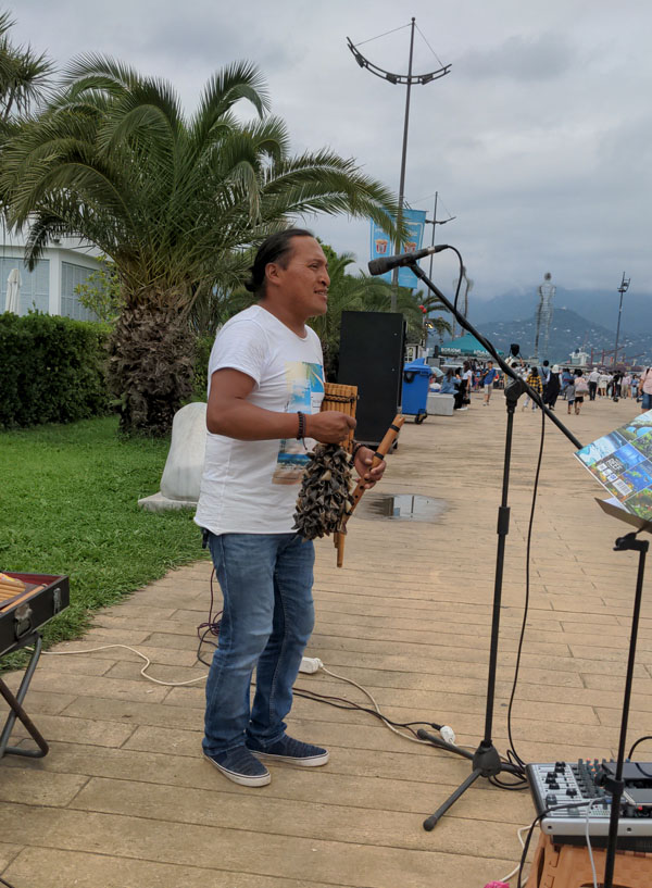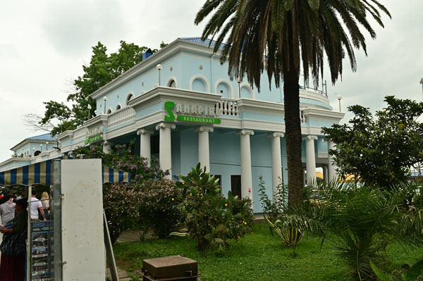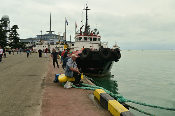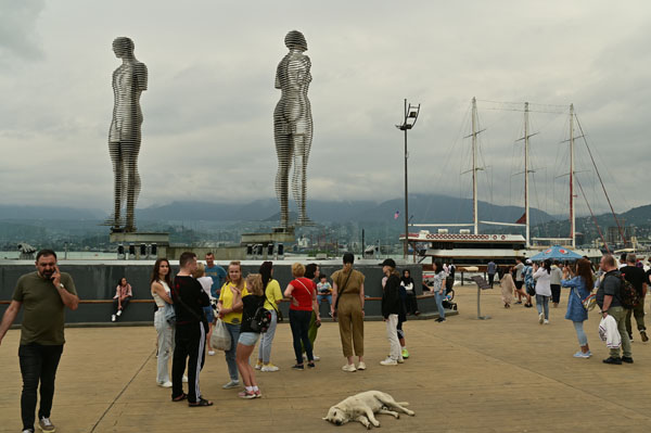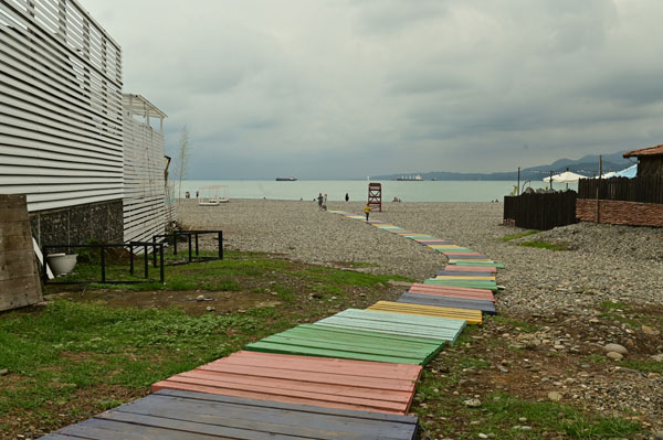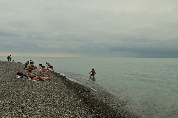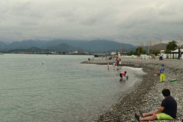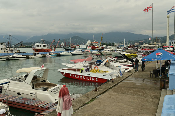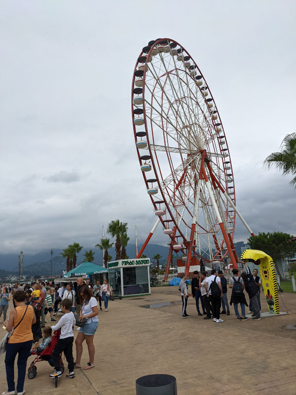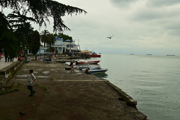 Une fois dépassé le port, nous voici sur la longue promenade de bord de mer sur laquelle se dresse une grande route fréquentée par de nombreux touristes russes. À deux pas de là, un chanteur de rue fait le show accompagné d’une musique latino. Étrange. Ils sont fous, ces Géorgiens !