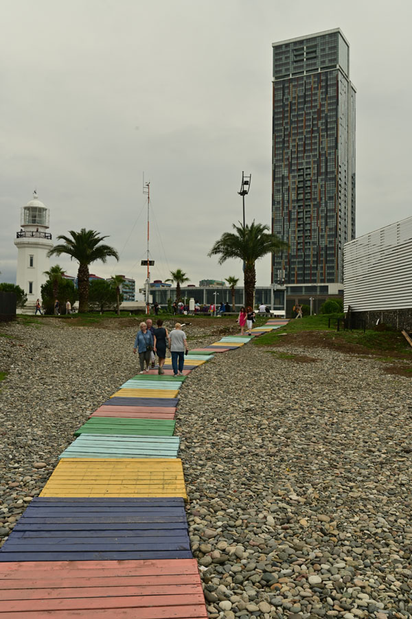 Batoumi est avant tout une ville de bord de mer au charme éclectique. Sa promenade maritime (Boulevard) longue de 7 km, jalonnée de palmiers, de sculptures contemporaines et de cafés, est idéale pour la promenade ou le vélo. Les plages de galets et de sable (comme celle de Sarpi près de la frontière turque) attirent les estivants. La ville a connu une transformation spectaculaire avec une architecture audacieuse, mêlant bâtiments historiques restaurés et gratte-ciels futuristes, dont la célèbre tour Alphabétique qui célèbre l’alphabet géorgien.