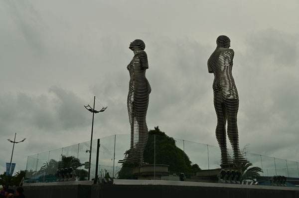 Un peu plus loin, ce sont deux immenses statues stylisées, un homme et une femme, qui fendent la grisaille du ciel. Autour de là, la foule s’agite et s’attroupe autour de chaque attraction. Tout ça reste bon enfant et plutôt familial.