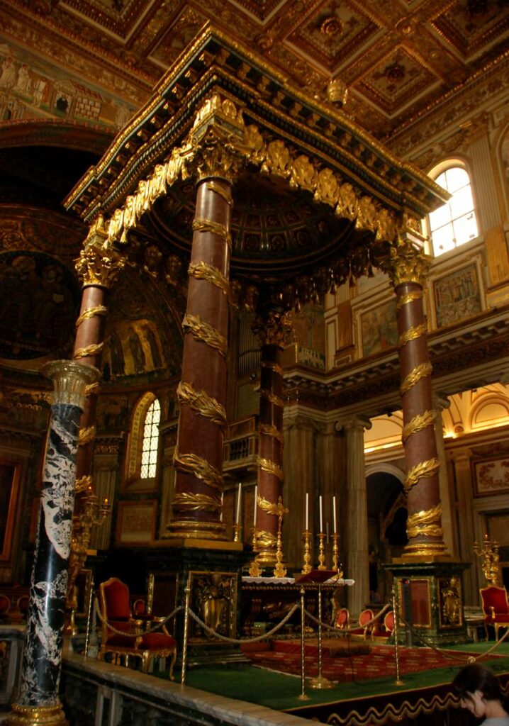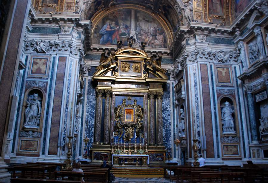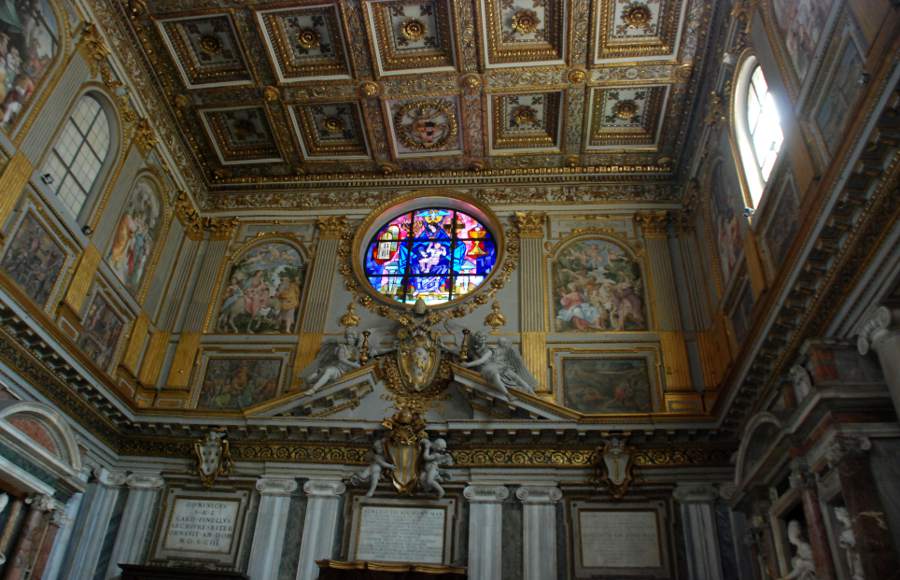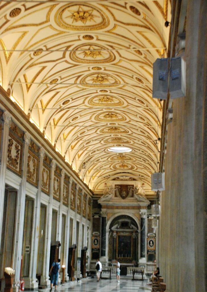 L’intérieur de l’église est une tuerie avec cette triple nef ornée d’un plafond à caissons Renaissance et d’un exceptionnel pavement en marbre. Les chapelles sont d’une beauté inouïe, comme celle de Pauline Bonaparte-Borghese, la sœur de Napoléon. Et que dire du maître-autel à colonnes de porphyre ! Exceptionnel encore.