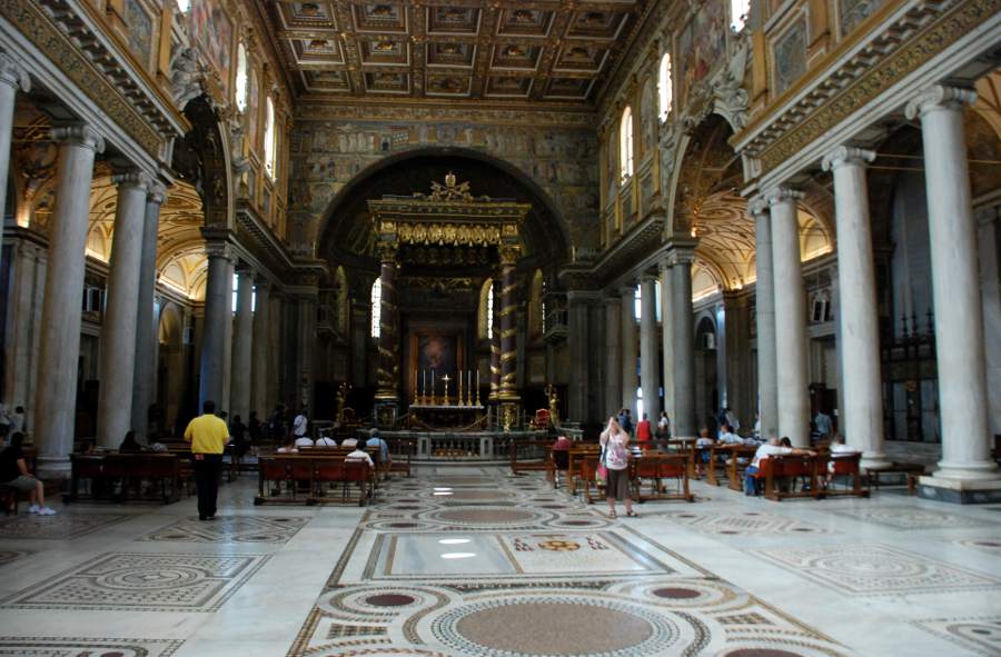 Sa structure conserve le plan basilical paléochrétien du Ve siècle, avec une nef bordée de colonnes monolithiques en marbre blanc, tandis que le plafond Renaissance est doré à l’or inaugural des Amériques, offert par les Rois Catholiques. Les mosaïques du Ve siècle dans la nef centrale comptent parmi les plus anciennes de Rome, dépeignant des scènes de l’Ancien Testament avec un naturalisme antique.