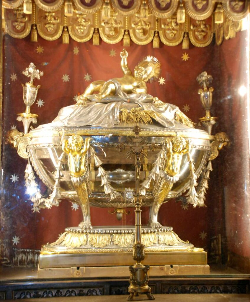 Il faut aussi lever la tête pour admirer les 36 panneaux de mosaïque déroulés le long des murs latéraux de la nef centrale. Datant du Ve siècle, ils racontent les scènes de l’Ancien Testament. À comparer avec le Couronnement de la Vierge de Torriti, mosaïque du Xe siècle exposée dans l’abside. Enfin, il ne faut pas manquer la relique du berceau du Christ.