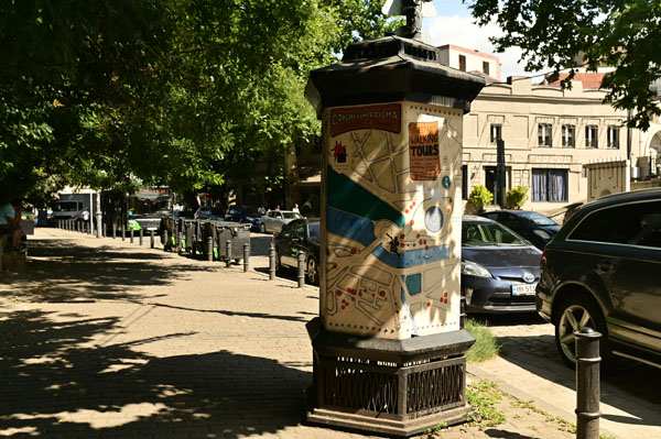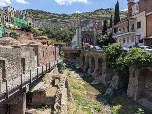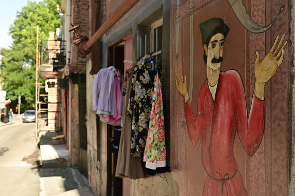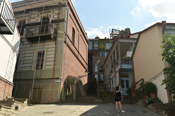 Pour atteindre le centre historique de Tbilissi, il nous faut encore remonter quelques artères pour arriver sur les rivages du fleuve qui coupe en deux la capitale. On commence par remonter un lacis de petites rues étroites bordées de maisons où tous les styles s’entrecroisent (on n’est pas au bout de nos peines pour ce qui du mélange !), puis on débouche bientôt sur une élégante voie piétonne.