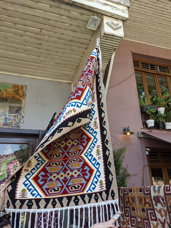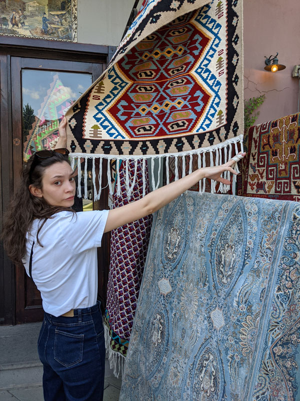 Voilà pour notre arrivée nocturne. Cinq heures plus tard, nous nous réveillons et ô miracle, ma fille ne rechigne pas à se lever pour que nous puissions profiter de cette journée de découverte de la capitale géorgienne ! Les premiers tapis d’Orient que ma fille aperçoit sur son passage finissent par la convaincre que, oui, elle vient en effet de plonger en plein cœur du Moyen-Orient, enfin tout du moins, dans sa partie la plus nordique.