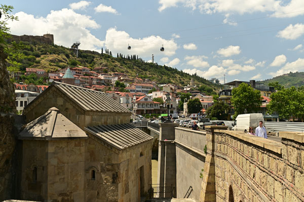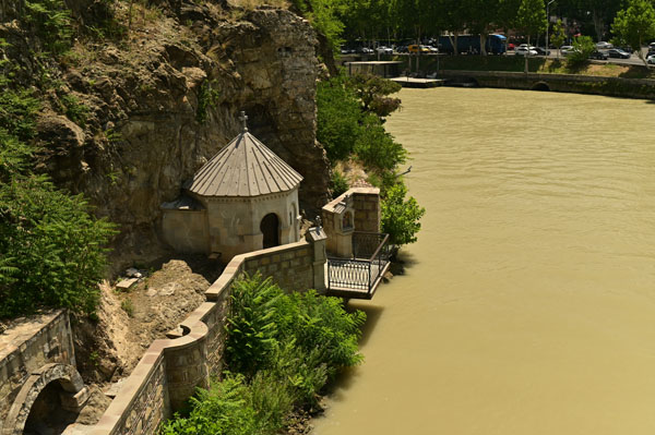 Depuis le parapet du pont de Métékhi, on aperçoit une minuscule petite église qui a l’air de surgir littéralement de la falaise. Il s’agit de l’église St Abo Tbileli. Enfin, en traversant le pont de Mitékhi, on embrasse d’un coup d’un seul regard toute la vieille ville accrochée à sa colline natale et le fleuve Mtkvari qui charrie dans son sillage des milliers de tonnes de sédiments arrachés au flanc des montagnes du Caucase. Voilà pour les premiers instants dans cette ville à nul autre pareil, une sorte de mirage intemporel qui, au fil des siècles, a su traverser les siècles en mélangeant les styles, les cultures, les époques et les influences venues d’orient, d’occident et des steppes nordiques.