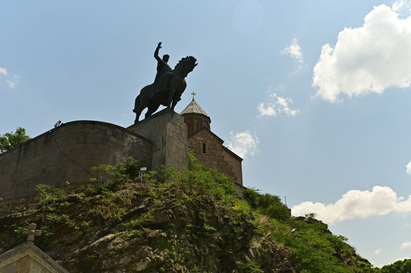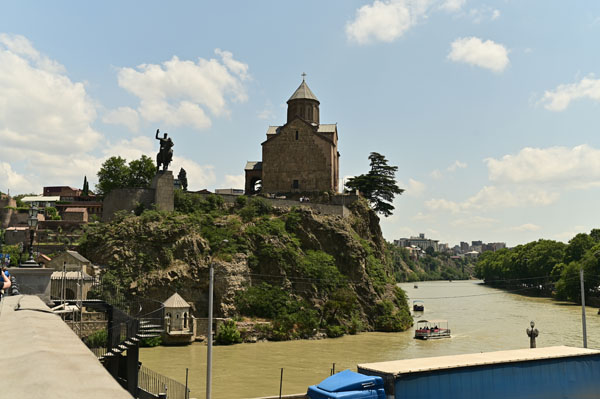 Enfin, voici le fameux pont de Métékhis, l’un des six ou sept ponts qui permettent de passer d’une rive à l’autre de la ville, ou plutôt d’un univers à un autre, tant la diversité de cette ville de Tbilissi va nous surprendre. Devant l’église de Métékhi, une immense statue domine de toute sa stature le fleuve Mtkvari qui coule en contrebas. Il s’agit de la statue du roi Vakhtang Gorgasali dont je reparlerai plus tard…