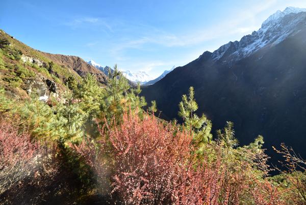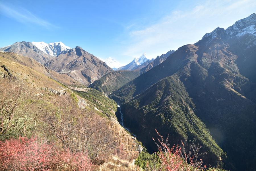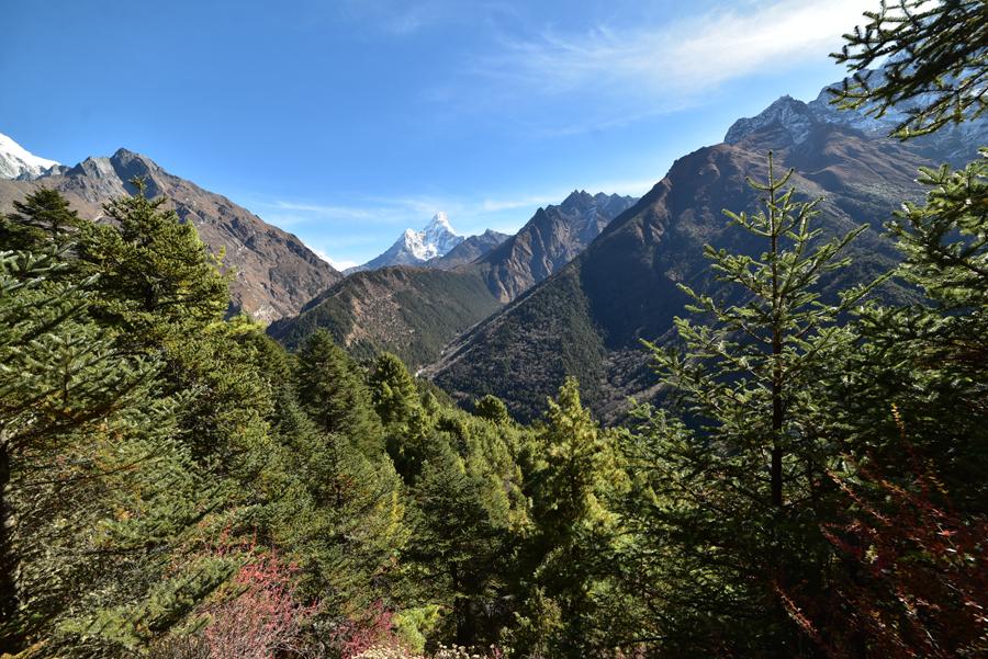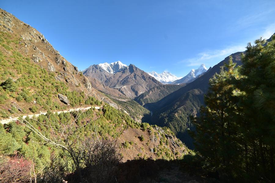 Là-bas, tout au bout de l’horizon, se dressent les silhouettes de l’Everest et d’Ama Dablam.