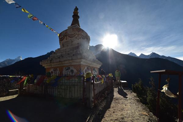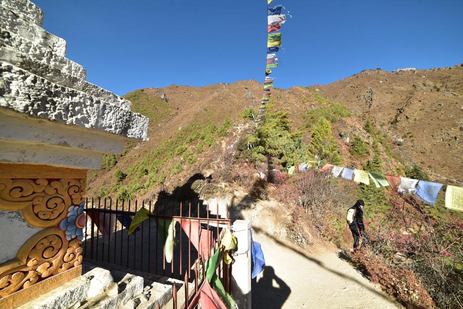 Sur le chemin, on croise la silhouette de cinq à six stupas qui permettent parfois de faire quelques haltes. Posés à flanc de montagne et hérissés de drapeaux de prières, leur blanc immaculé éclate sous les lumières du soleil matinal.