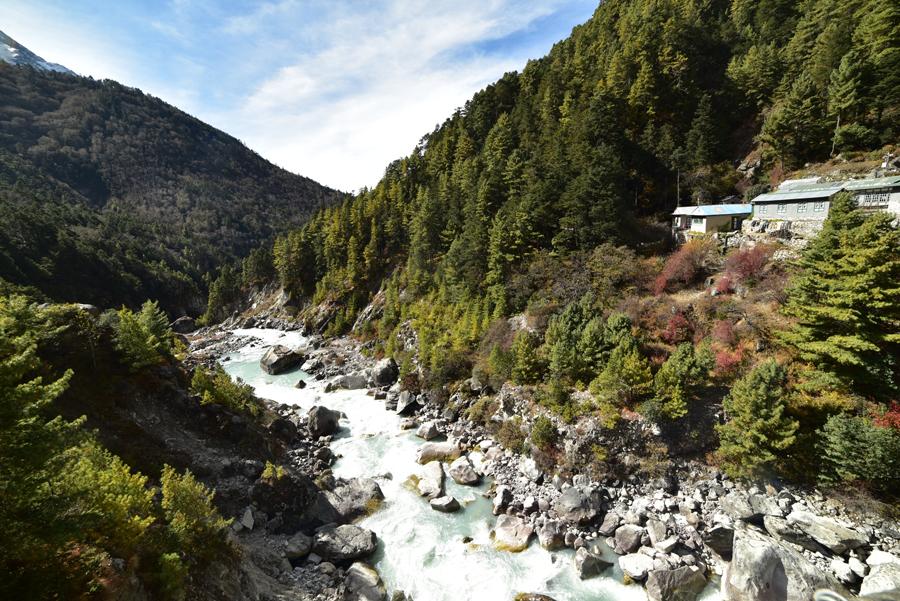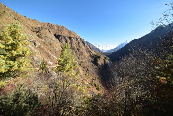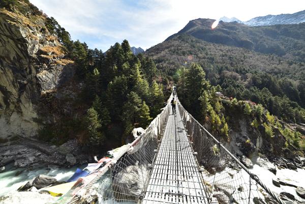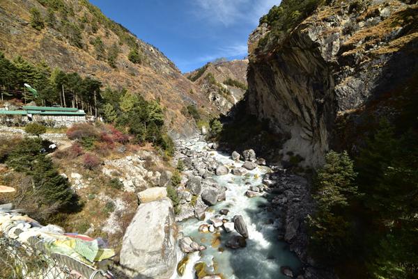 De ce côté-ci de la vallée, la rivière himalayenne a pris le nom de Imja Khola. On l’enjambe de nouveau grâce à un joli pont suspendu.