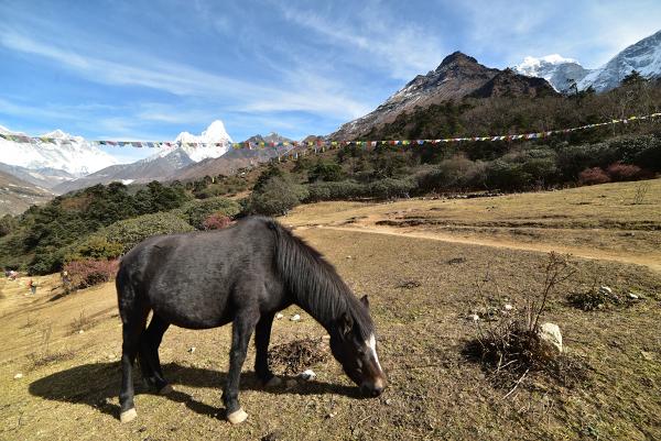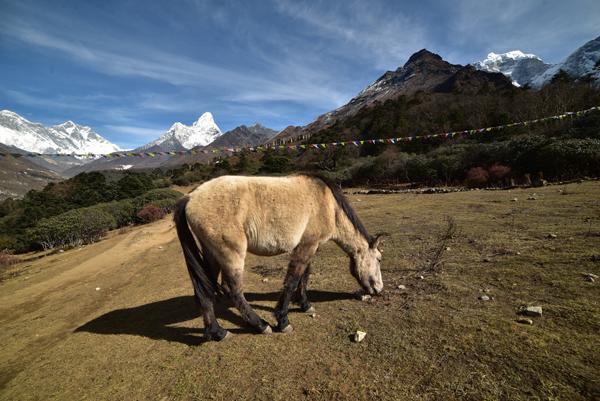 Puis on reprend notre route vers Pangboche où nous irons dormir ce soir. On laisse sur notre droite le village de Dengboche et on remonte une vaste plaine taillée au milieu des sommets. À l’approche du village, on croise quelques chevaux sauvages qui profitent des herbages.