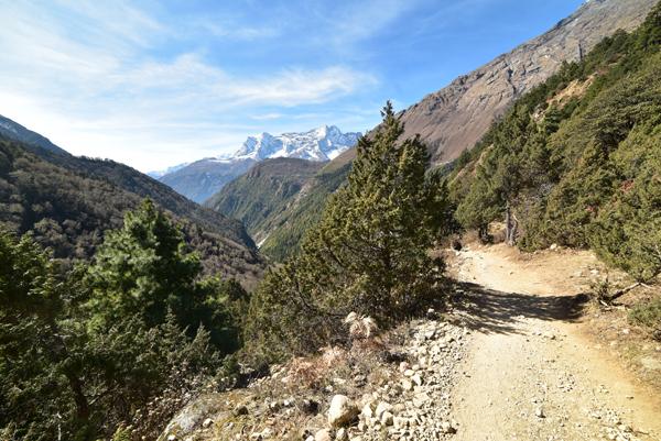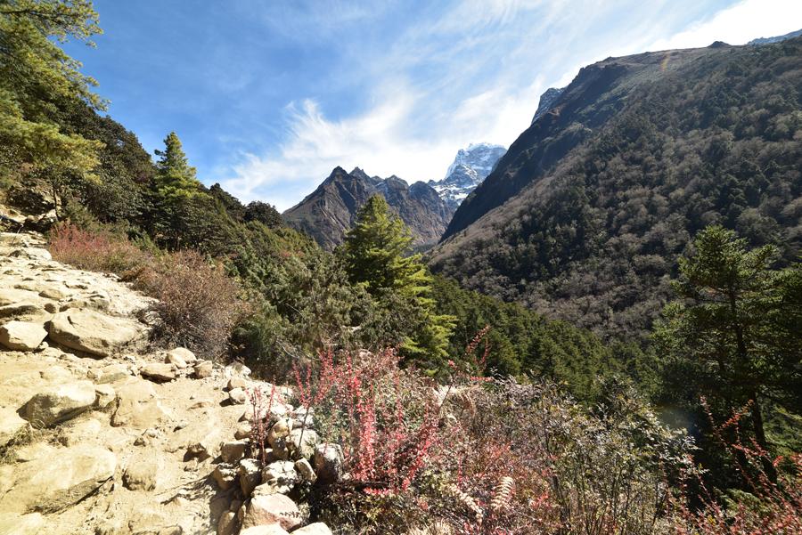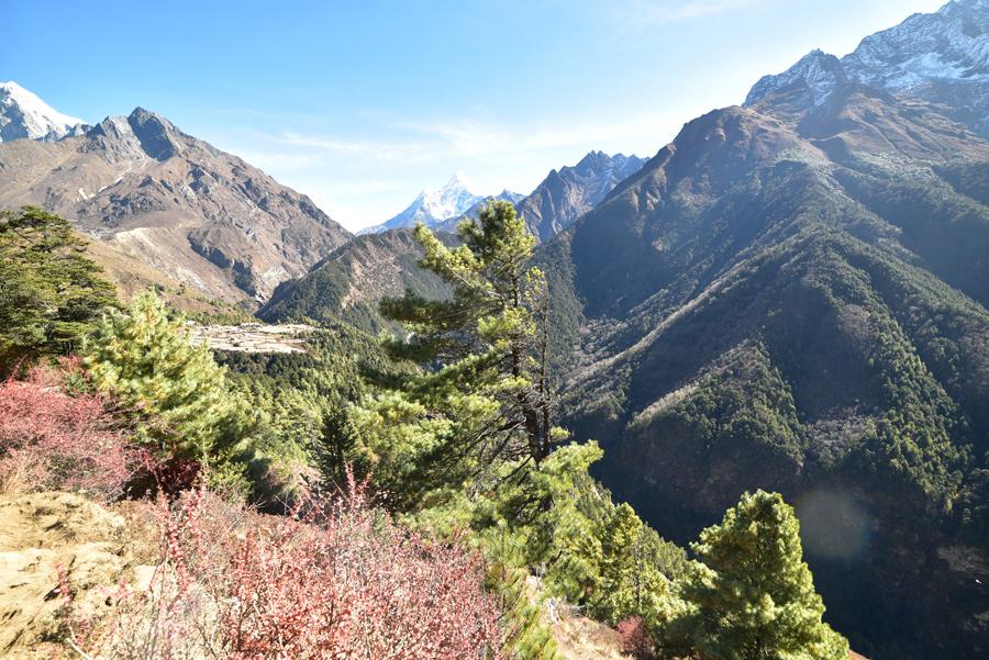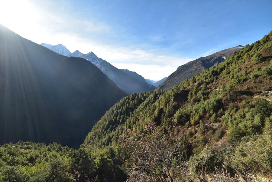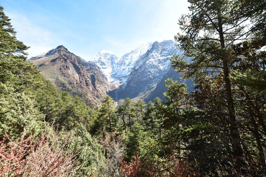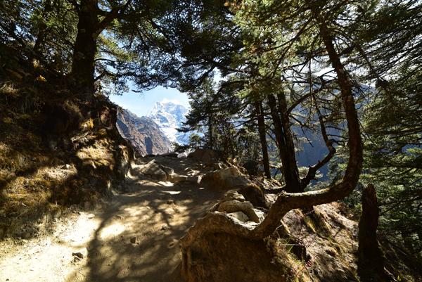 Le temps de s’écarter pour laisser passer un troupeau de yaks chargés de bidons d’eau, et on s’approche du petit village de Deboche, dernière étape avant Pangboche (4.300m) où nous nous arrêterons pour passer la nuit. En attendant, on file tout droit à travers cette merveilleuse forêt de sapins pour rejoindre le village de Deboche (4.200 m).