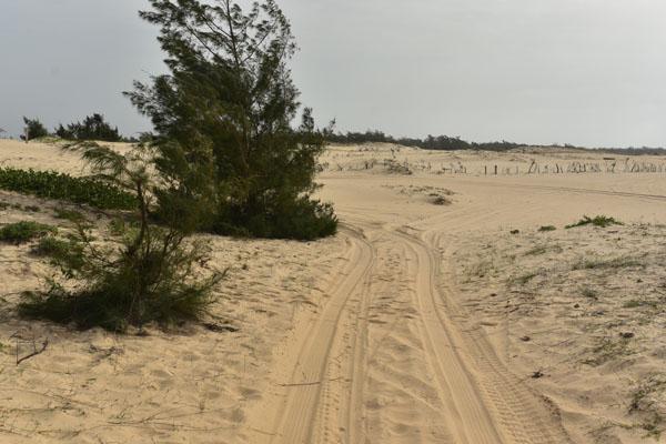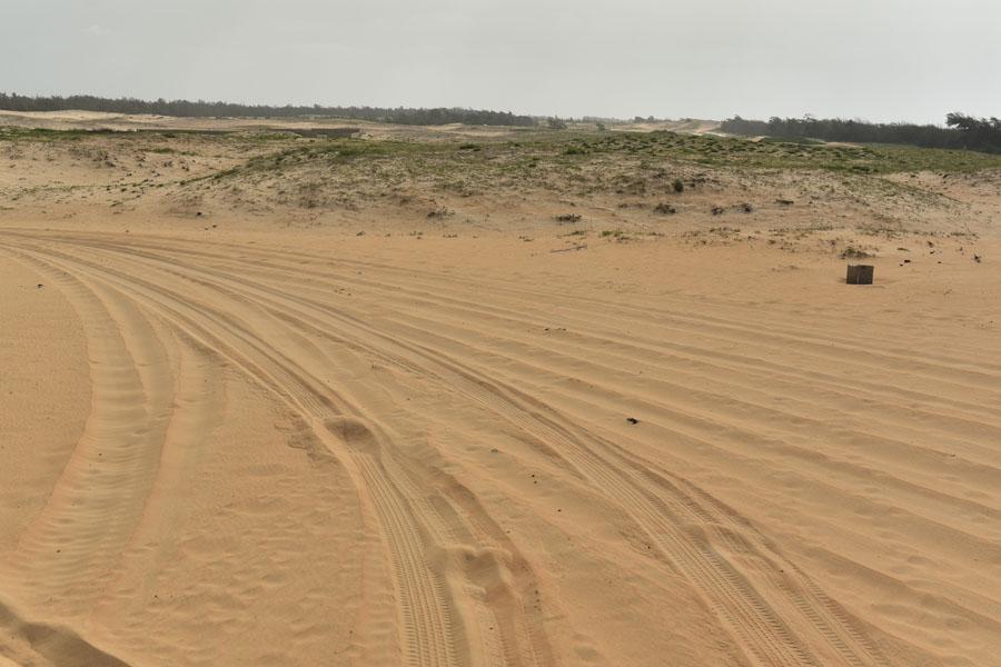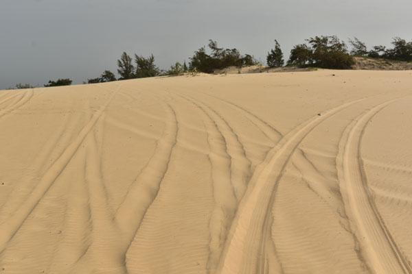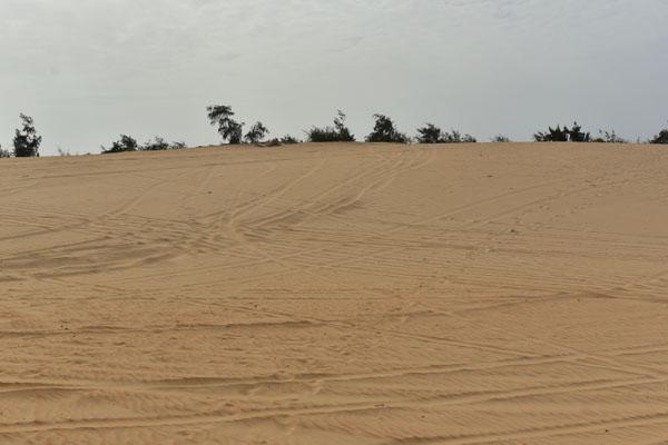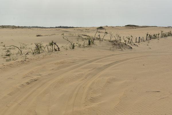 Ça bouge dans tous les sens et on crapahute tant bien que mal, de dune en dune. Derrière moi je regarde avec stupéfaction les traces laissées par les engins qui se sont succédé ici pendant toute la journée. Pas vraiment écologique ce genre d’activité. Encore moins quand on pense aux ravages que font ces bagnoles aux écosystèmes des dunes.