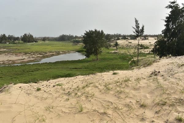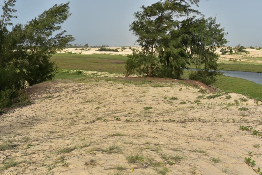 Un peu plus haut, à l’extrémité de la langue dunaire, le paysage est plus joli avec les oasis et la brousse qui rejoignent le sable.