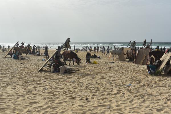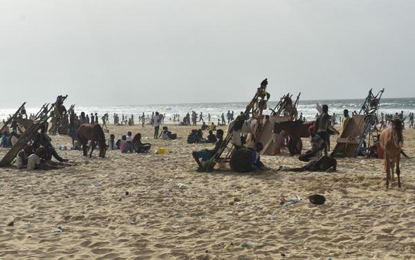 Un peu plus loin, une longue cohorte de charrette et de chevaux s’égrène le long de la plage. Les attelages patientent qu’un des baigneurs présents sur la plage ait envie de s’en retourner à l’hôtel sans marcher de longues minutes sur le sable.
