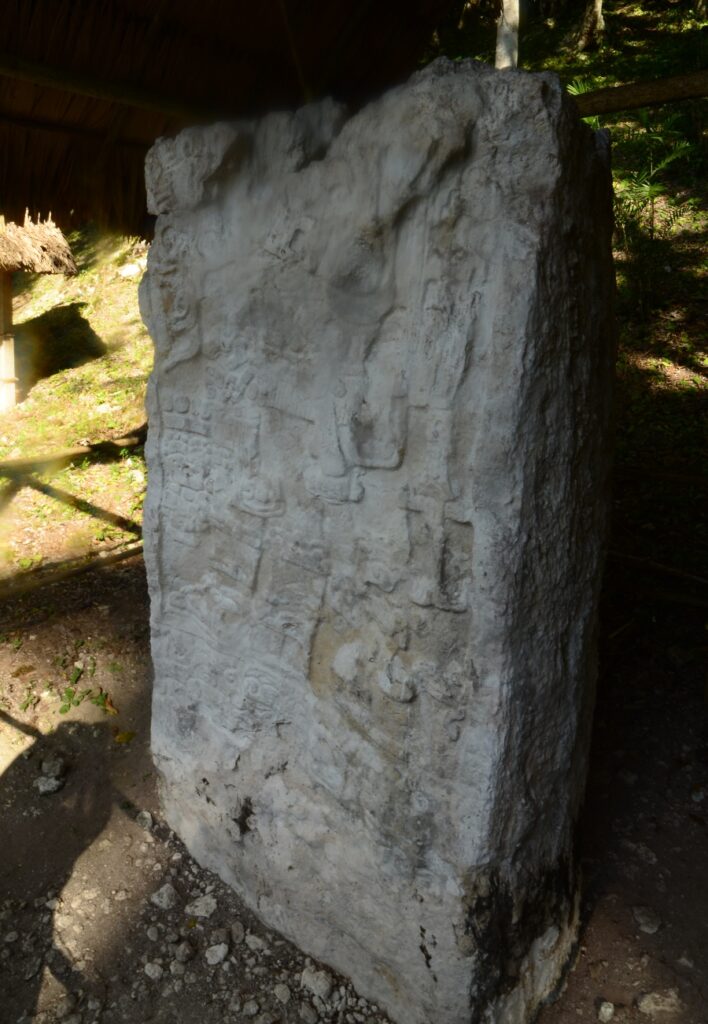 À l’entrée, notre guide nous explique quelques fondements de l’écriture et des mathématiques mayas en s’appuyant sur les stèles érigées devant la pyramide du Jaguar. Encore lui !
