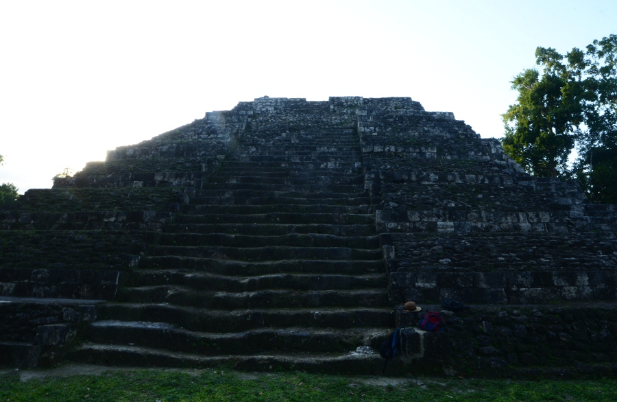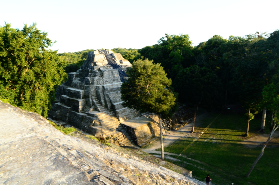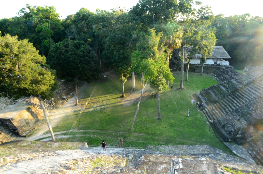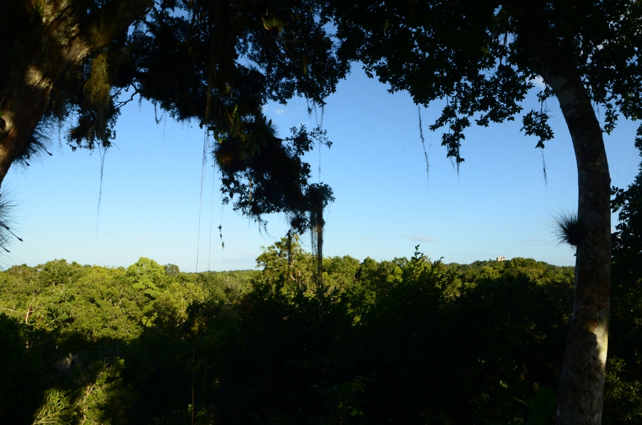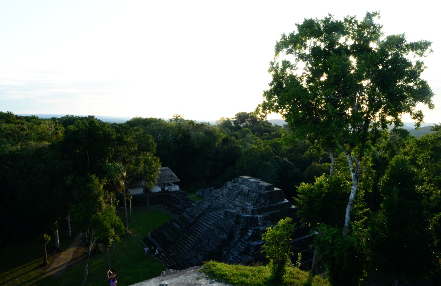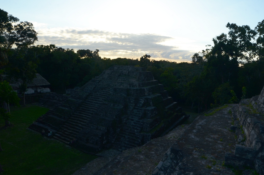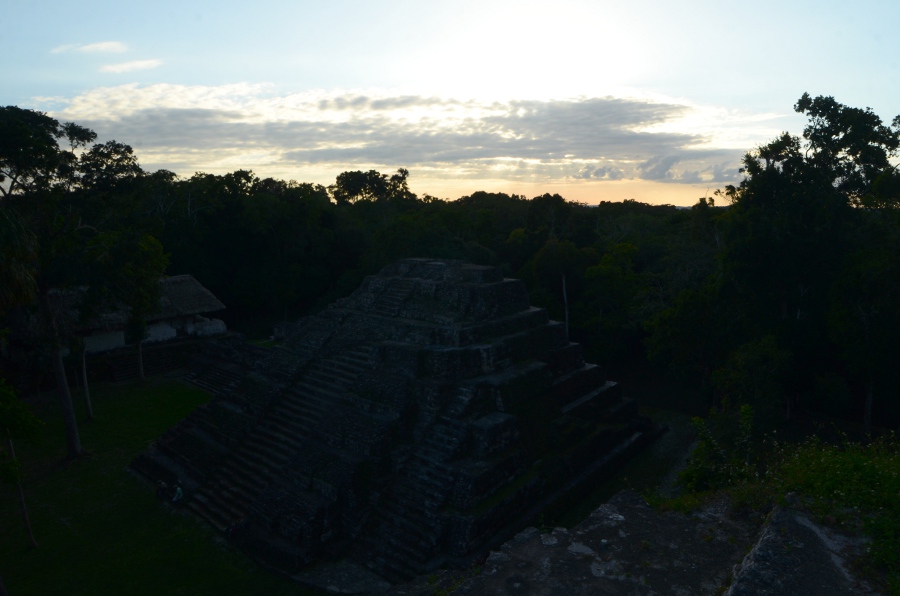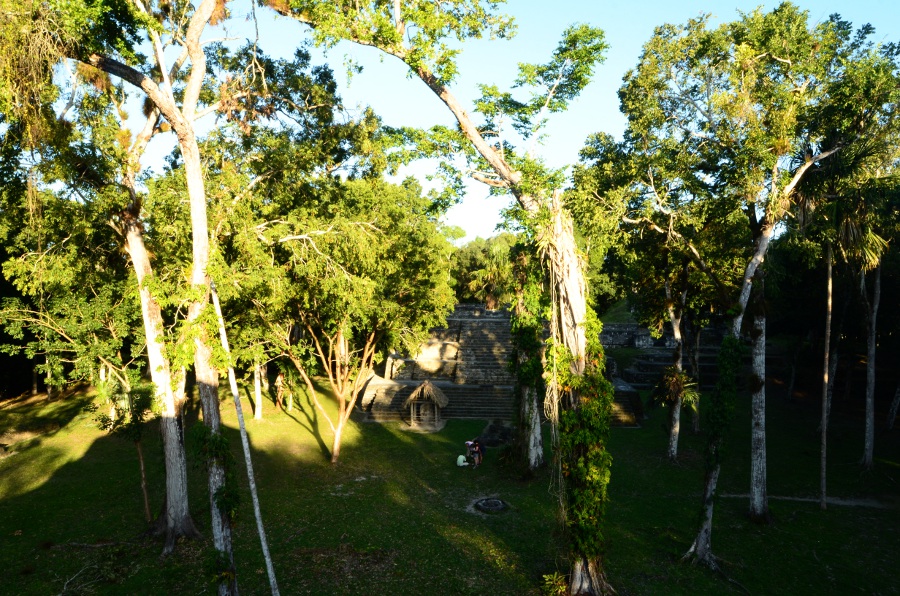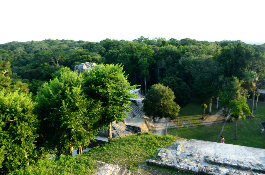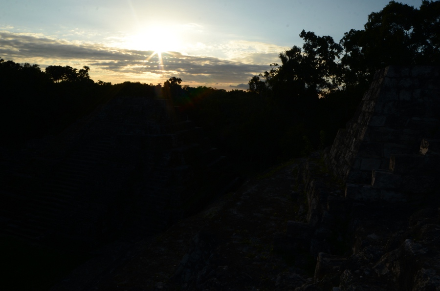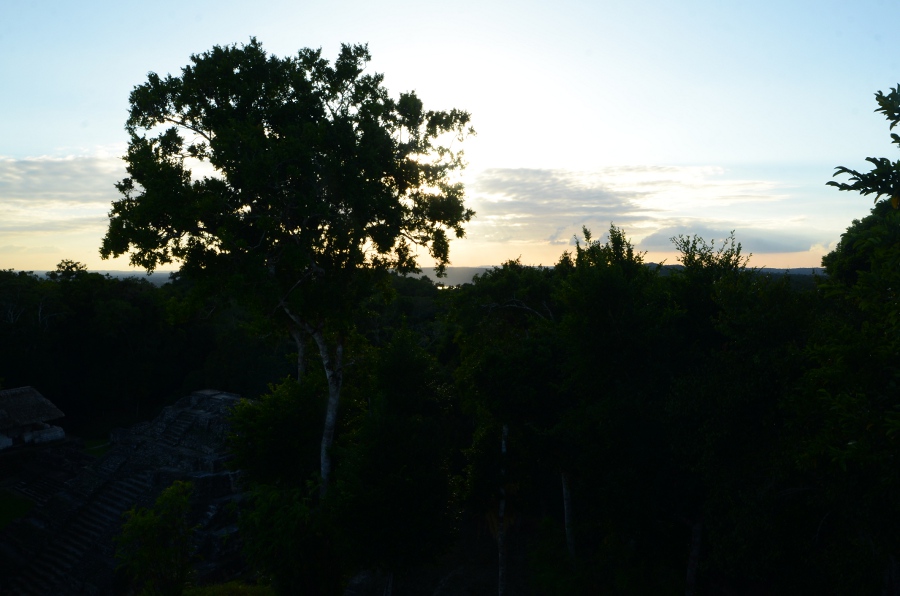 Deux grandes pyramides se font face, tandis que la troisième, sans doute un observatoire, se positionne en retrait de chacune d’elles. En tournant la tête, on peut observer le soleil décroître sur l’horizon, touchant le sommet de la pyramide est. Magnifique. De l’autre côté, la forêt tropicale s’étend jusqu’à perte de vue.