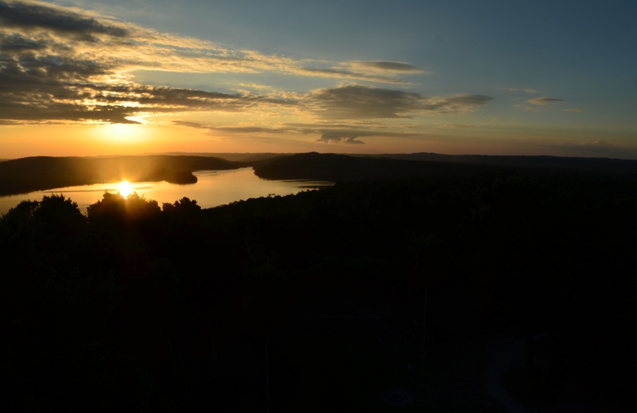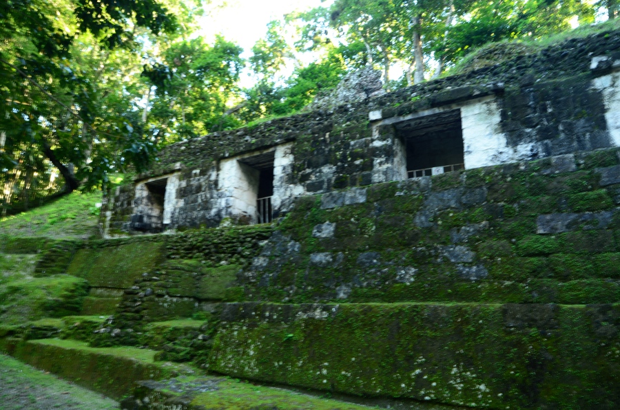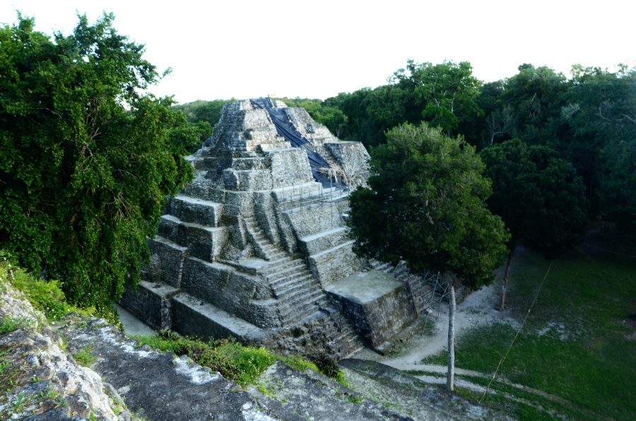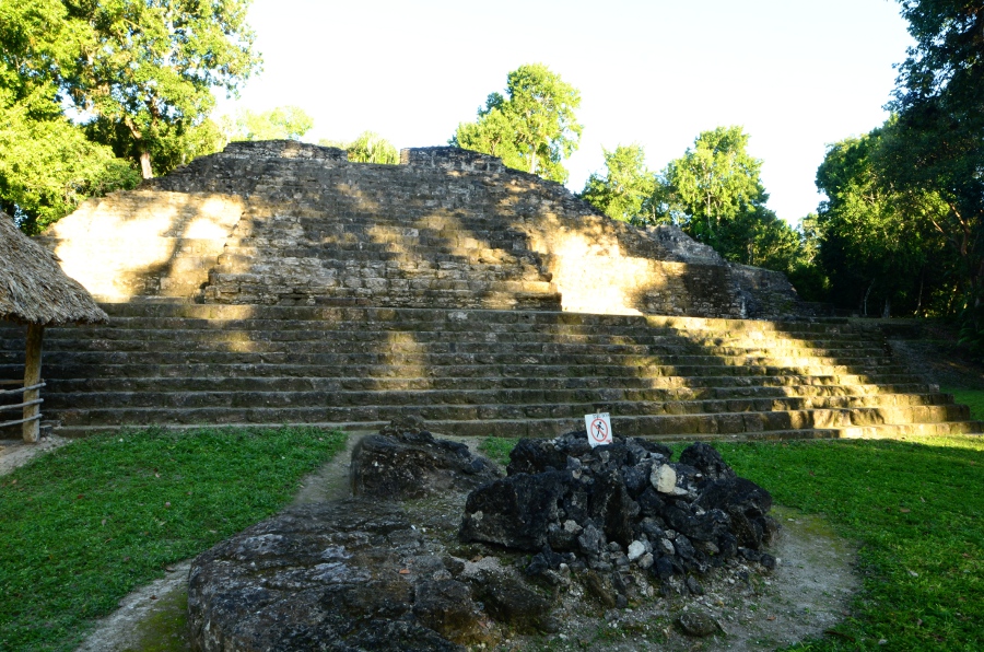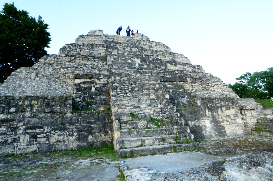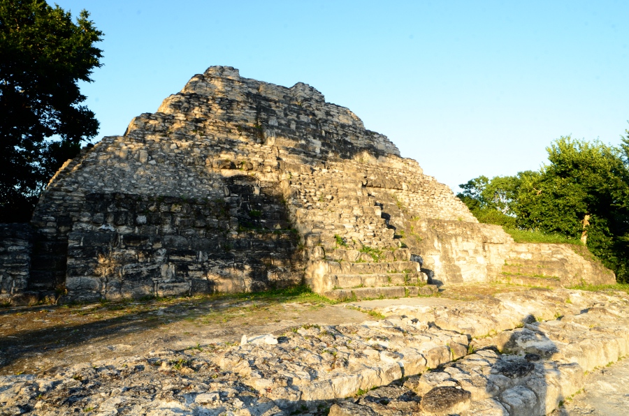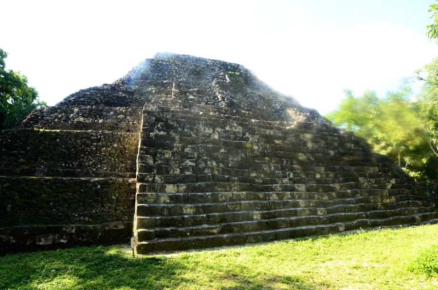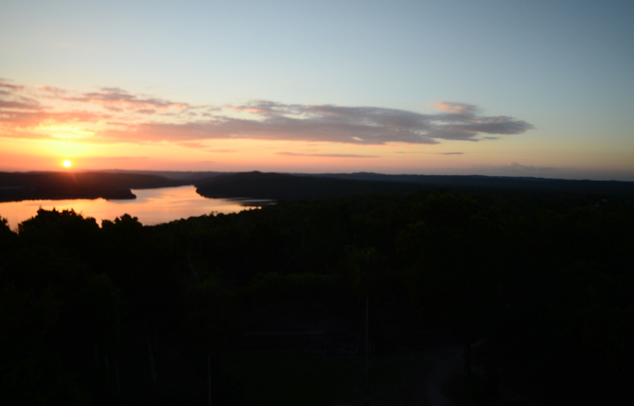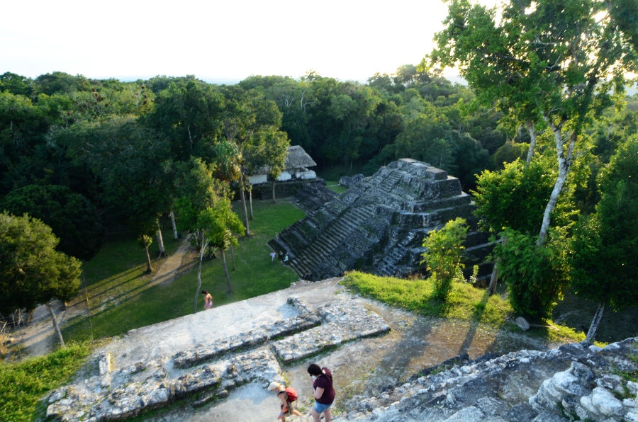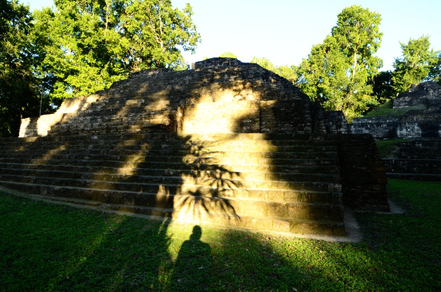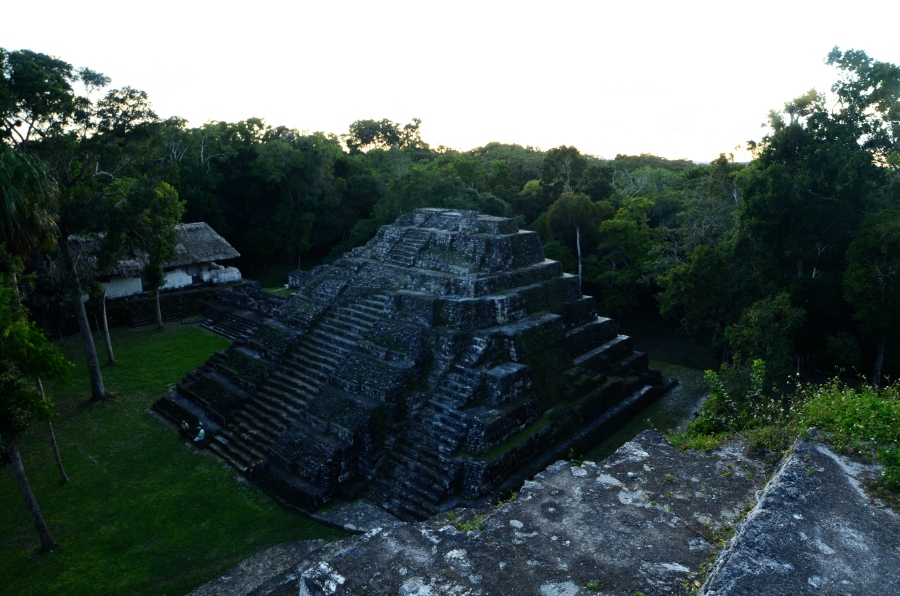 Deux grandes pyramides se font face, tandis que la troisième, sans doute un observatoire, se positionne en retrait de chacune d’elles. En tournant la tête, on peut observer le soleil décroître sur l’horizon, touchant le sommet de la pyramide est. Magnifique. De l’autre côté, la forêt tropicale s’étend jusqu’à perte de vue.