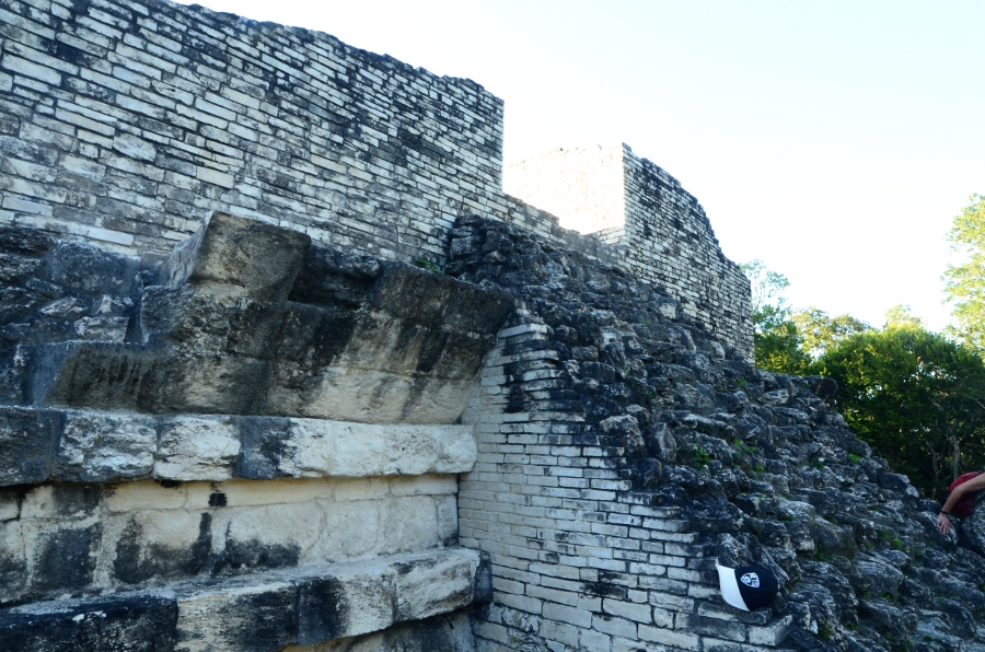 Bon, à dire vrai, je n’ai pas vraiment tout compris du système de comptage des Mayas, de leurs traits et de leurs points qu’on retrouve également sur les billets de banque actuels, mais j’en profite pour lever la tête vers la pyramide du Jaguar. Moi et les mathématiques.
