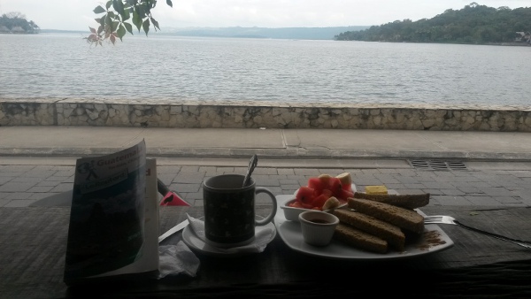 Vendredi 27 janvier. Matinée tranquille aujourd’hui. Prochaine excursion prévue en début d’après-midi pour partir sur les traces de la cité perdue de Yaxha. Du coup, je profite de ma matinée pour prendre un bon petit-déjeuner au bord du lac Petén et lire un peu. Ça fait du bien aussi de profiter pleinement des vacances.