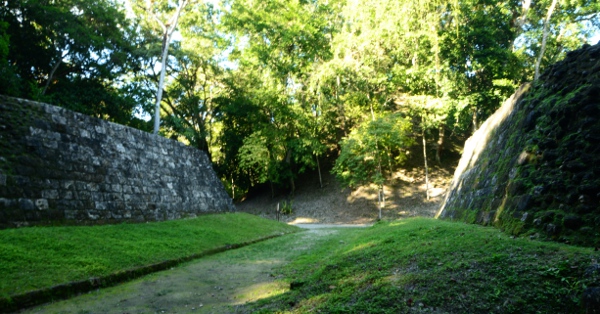 Plus loin, c’est une autre structure tout aussi familière des sites mayas qui apparaît : un jeu de balle flanqué de ses vestiaires et de ses tribunes.