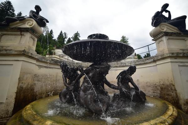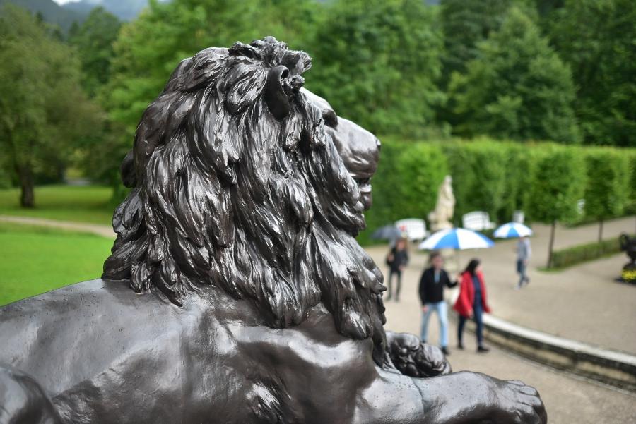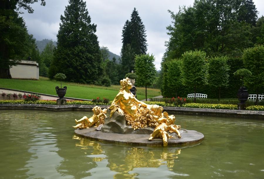 L’exemple le plus frappant de la folie de Louis II est autrement plus visible en faisant un tour des vastes jardins qui entourent sa si petite demeure. Ici, tout n’est que luxe, bassins, jardins à la française et statues dégoulinantes d’or.