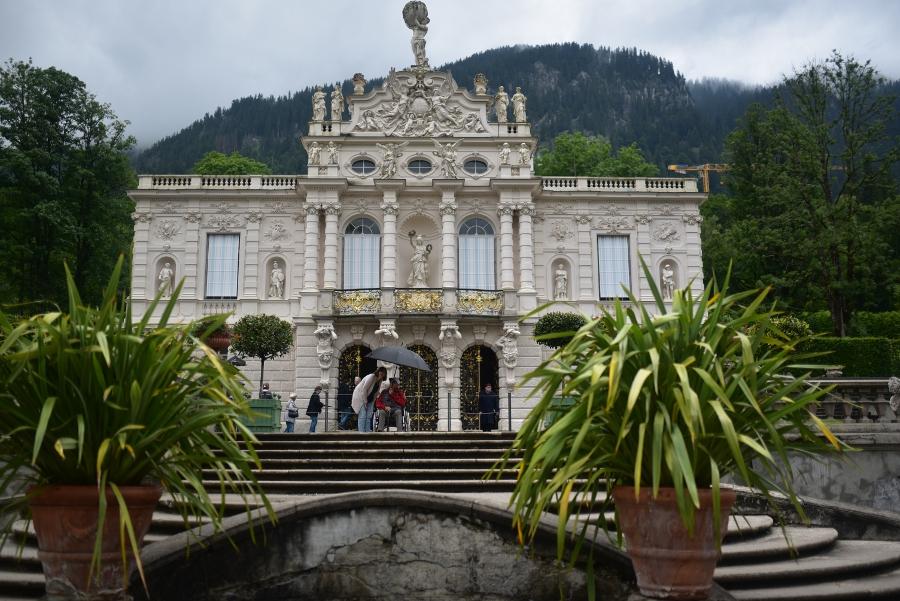 Samedi 15 juillet. Demi-tour toute et une trentaine de kilomètres plus au sud pour faire une petite halte au château de Linderhof, au nord de la station de Garmish-Partenkirchen… En quelque sorte, à juste quelques kilomètres de Eittal où j’ai passé la nuit. Je me demande bien si j’ai bien étudié mon parcours, moi, ce matin… Bon, château de Linderhof, c’est vite dit.