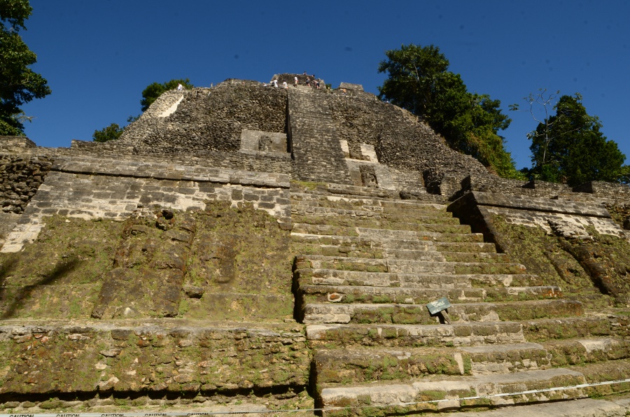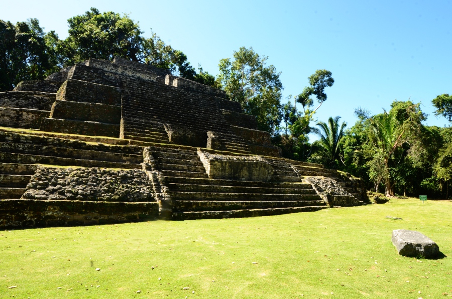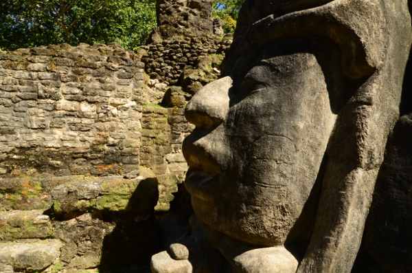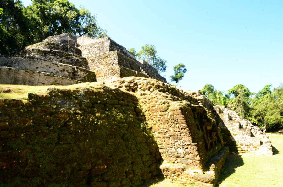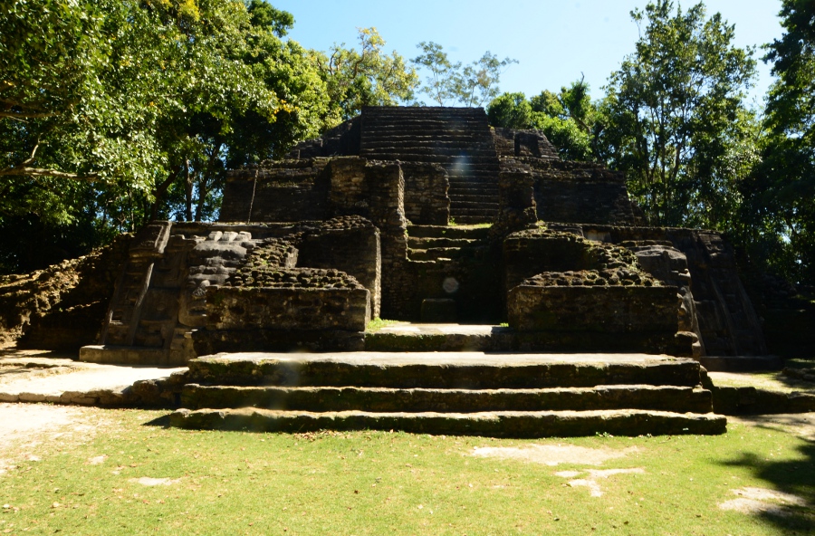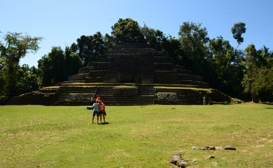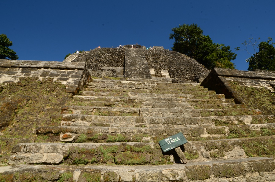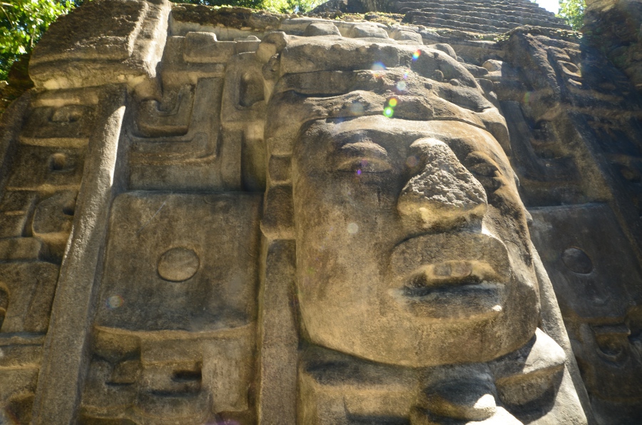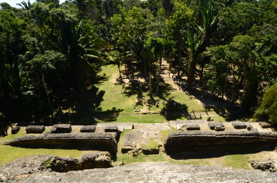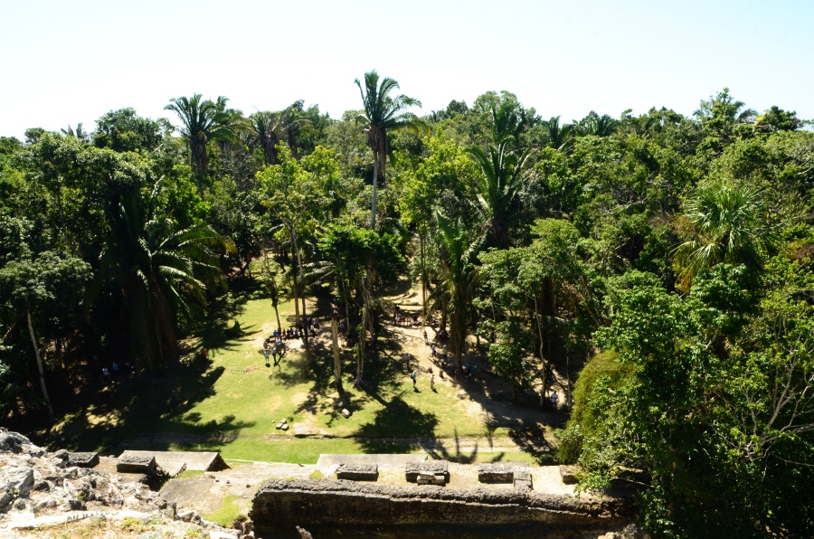 Du haut de ses 33 mètres, c’est une mer de verdure, d’arbres et de jungle que l’on peut admirer. À gauche, on peut apercevoir les méandres de la New River. Datant de 100 av. J.-C., le temple a été érigé sur un ancien quartier résidentiel. Bon, le Routard indique que la grimpette est plutôt corsée, mais à vrai dire, il n’y a vraiment aucune difficulté. Une bonne petite dose d’exercice… De quoi me faire oublier que je viens d’exploser le pare-soleil de mon 14 mm contre des ruines de Lamanai. Heureusement, l’objectif n’est pas touché. « It’s ok, guys. Let’s go. Show must go on. »