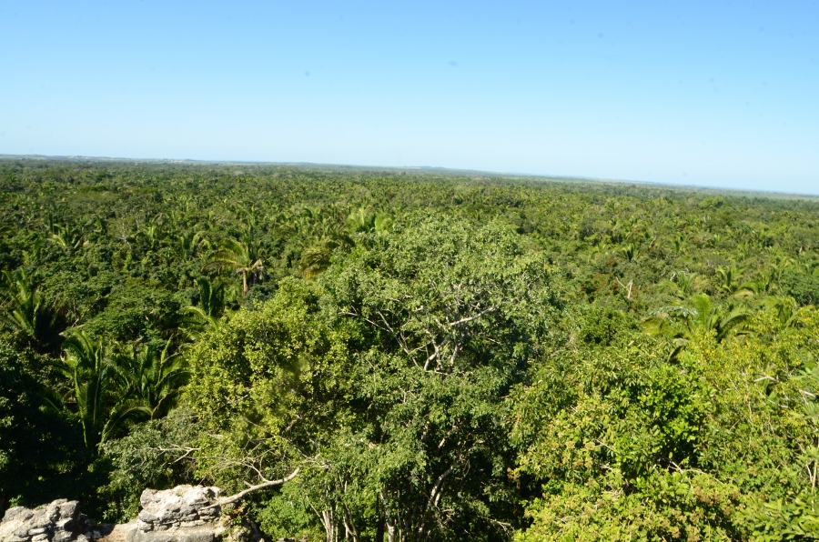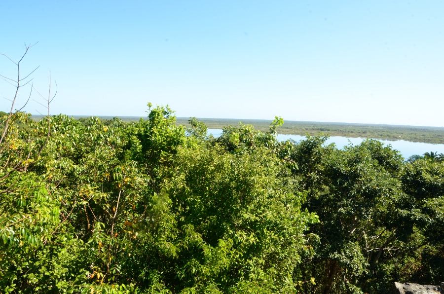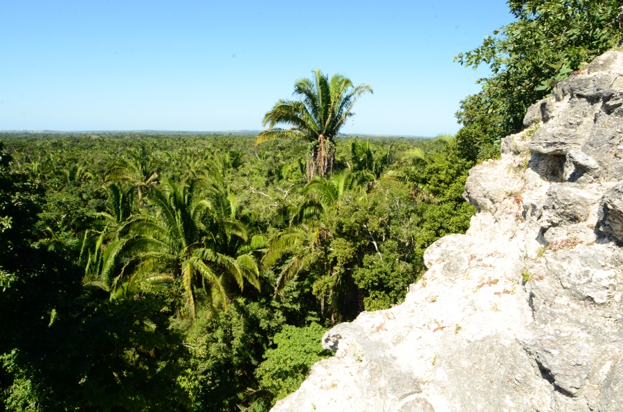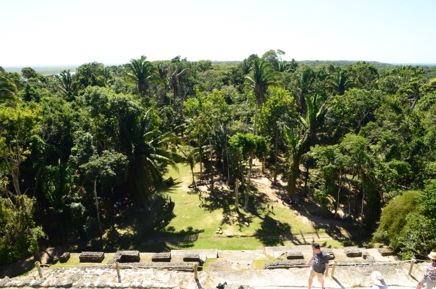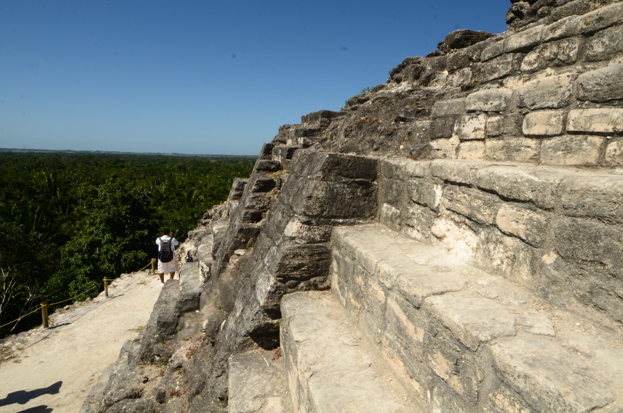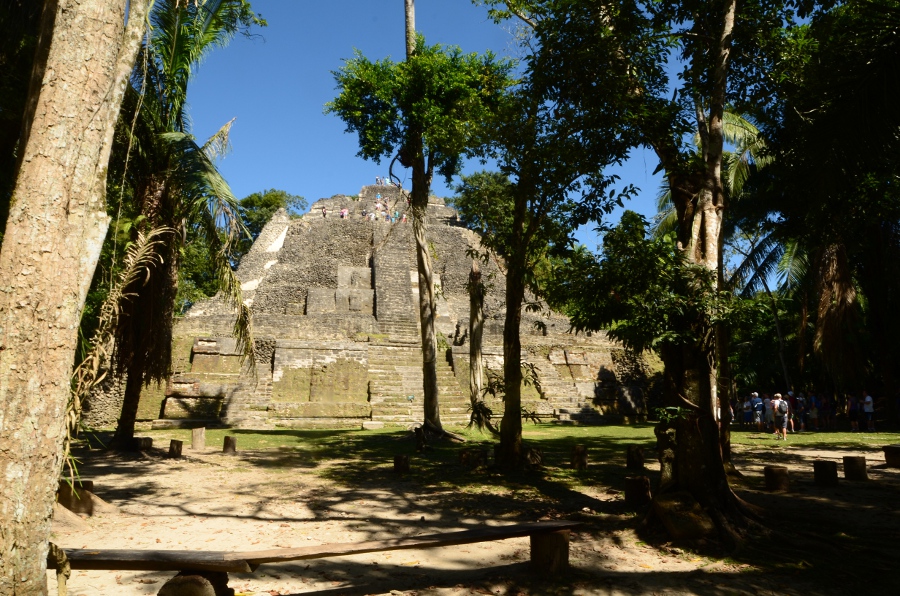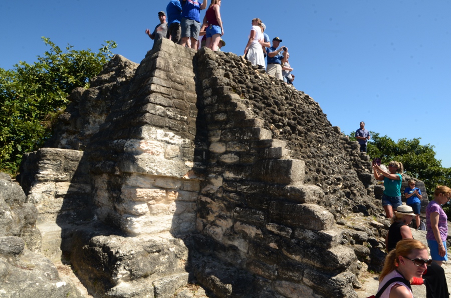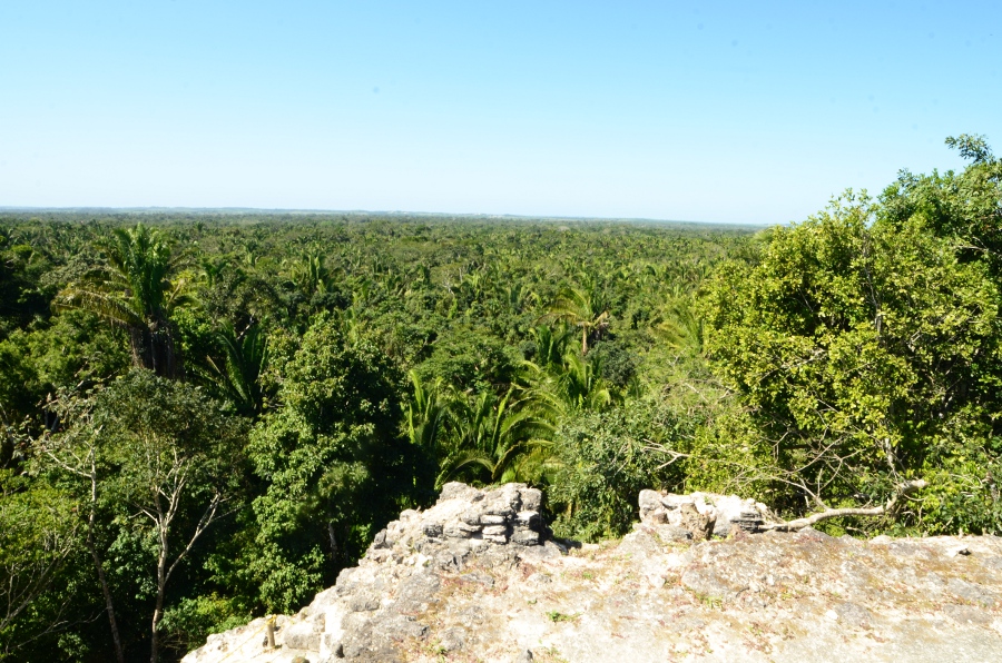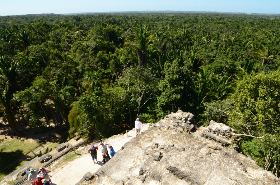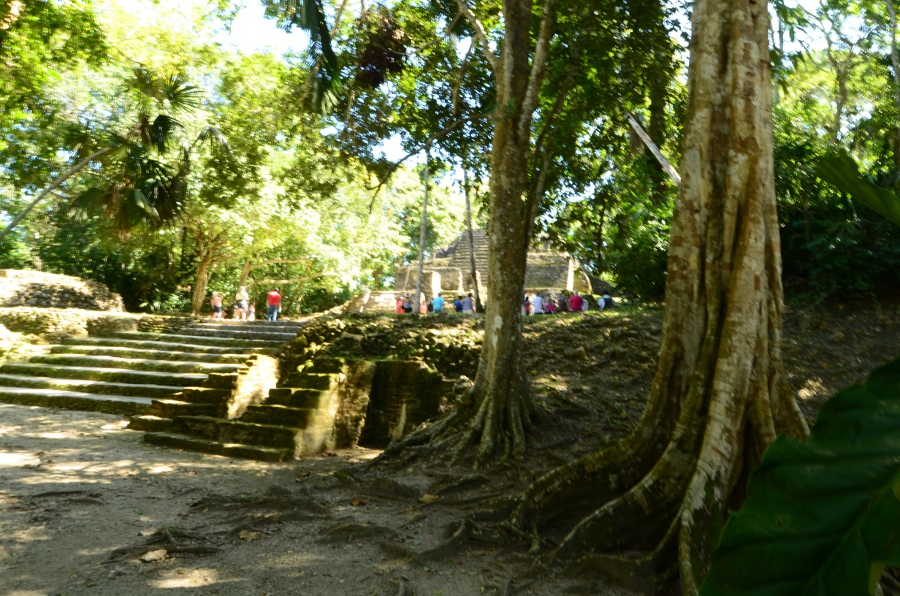 Du haut de ses 33 mètres, c’est une mer de verdure, d’arbres et de jungle que l’on peut admirer. À gauche, on peut apercevoir les méandres de la New River. Datant de 100 av. J.-C., le temple a été érigé sur un ancien quartier résidentiel. Bon, le Routard indique que la grimpette est plutôt corsée, mais à vrai dire, il n’y a vraiment aucune difficulté. Une bonne petite dose d’exercice… De quoi me faire oublier que je viens d’exploser le pare-soleil de mon 14 mm contre des ruines de Lamanai. Heureusement, l’objectif n’est pas touché. « It’s ok, guys. Let’s go. Show must go on. »