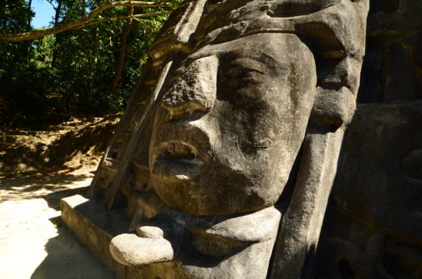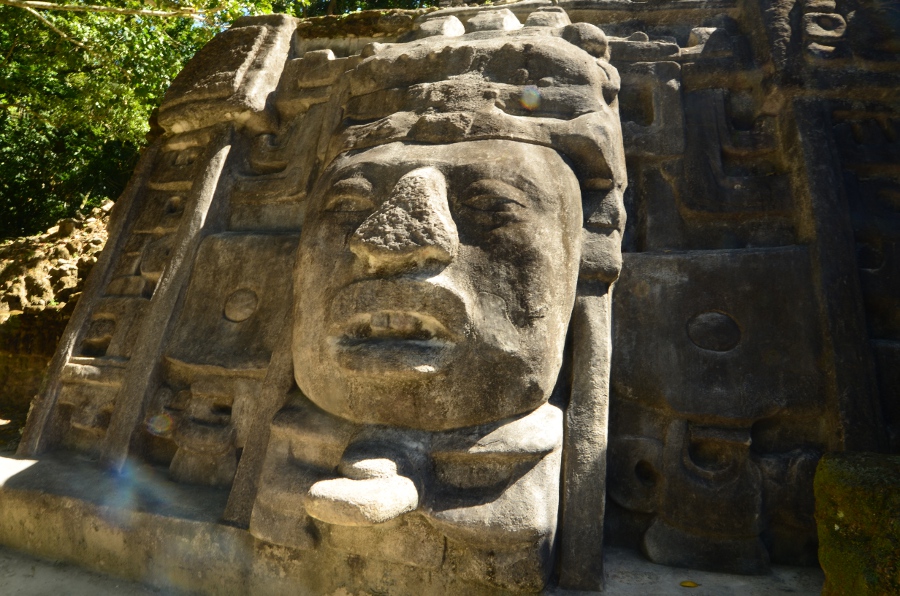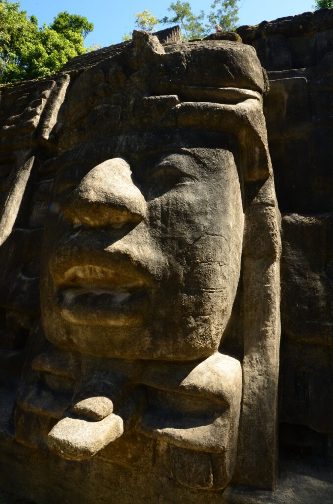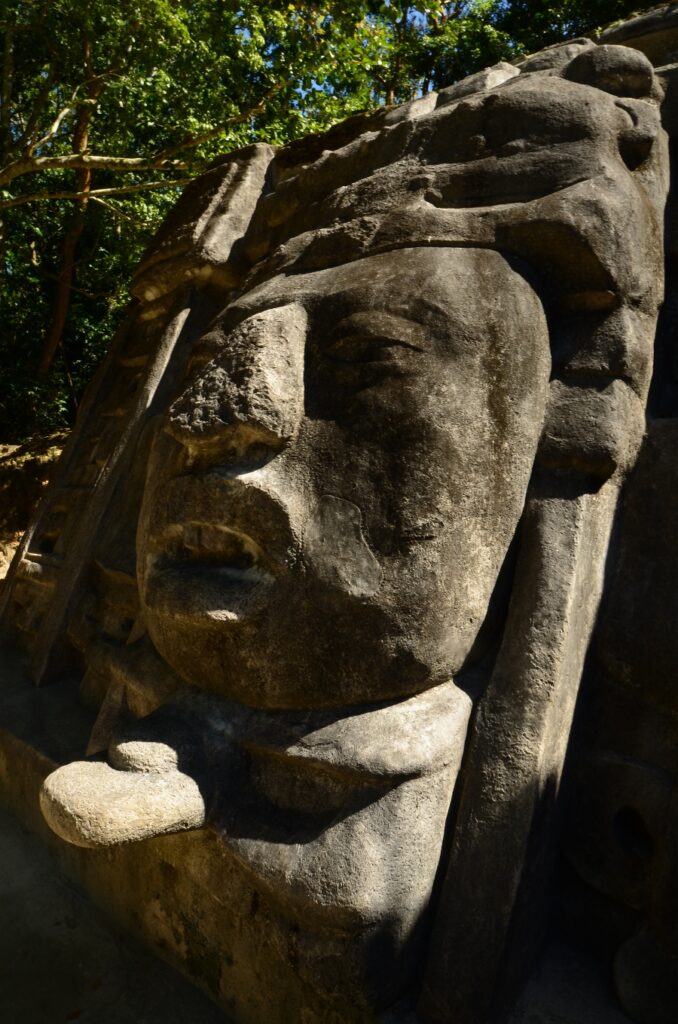 Un site unique dans tout l’empire maya. Il n’y a qu’ici qu’on peut admirer des blocs taillés et sculptés apposés sur la façade d’un temple. Les deux immenses masques qui ornent la façade de la pyramide représentent le dieu Olmèque, le dieu du Soleil. Le temple a été remanié à plusieurs reprises entre 200 av. J.-C. et 1300 ans de notre ère. Ces deux masques sont considérés comme les plus beaux du monde maya. Pour l’anecdote, celui de gauche a le nez coupé… Ça ne vous rappelle rien, amis égyptologues ?