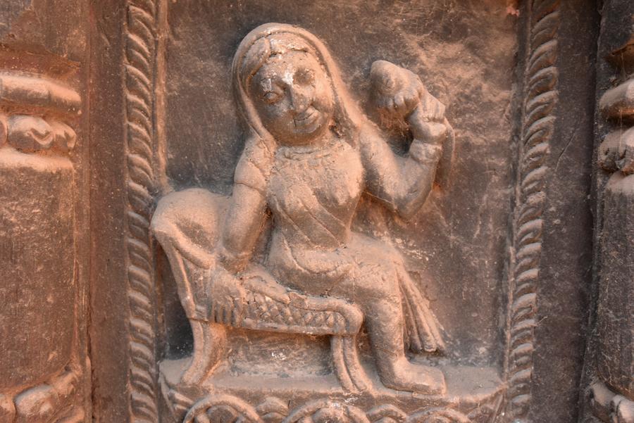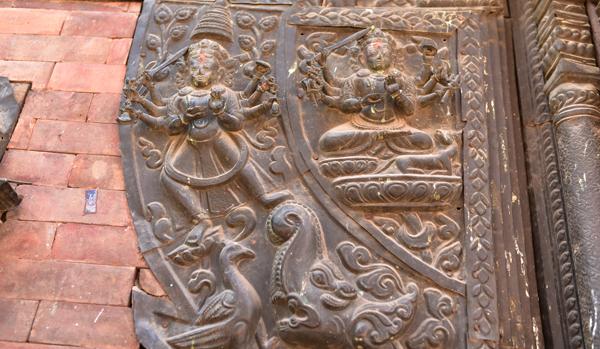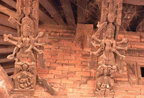 Retour au temple de Dattatraya pour observer les statues de Vishnu sculptées sur les poutres de la charpente du toit qui soutient la pagode principale. Sublimes de beauté.