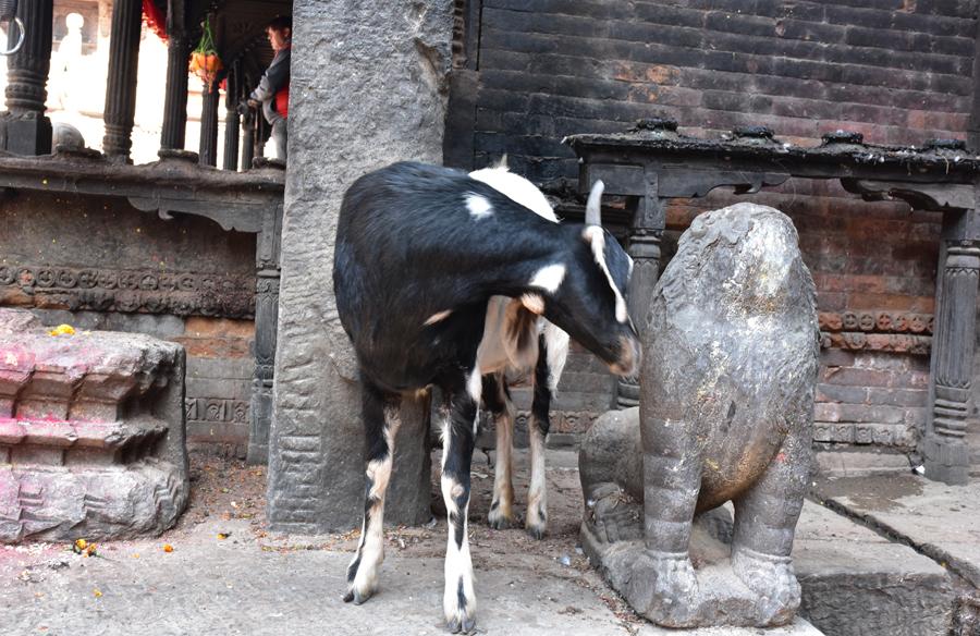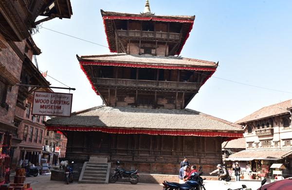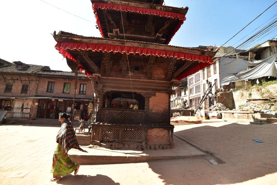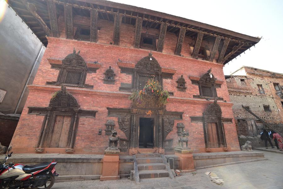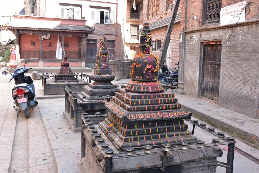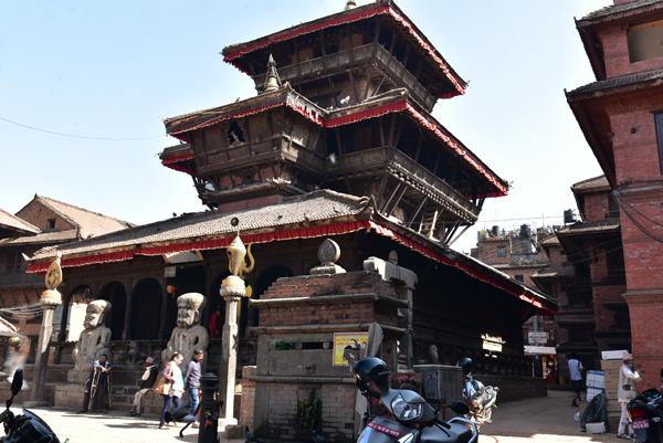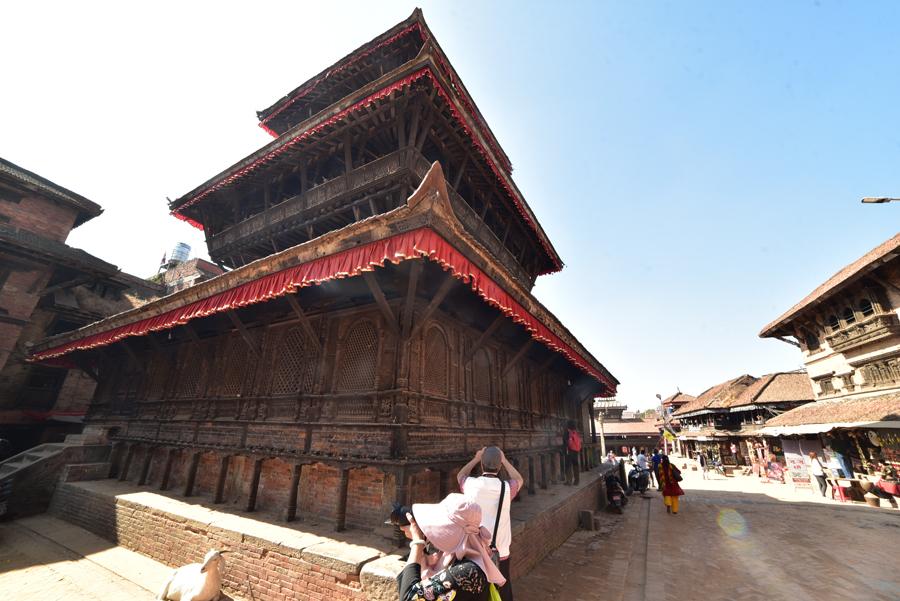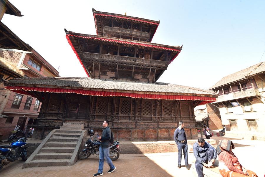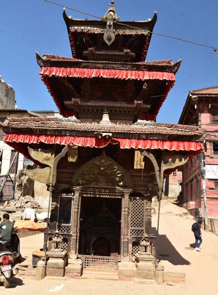 Avant d’arriver à l’extraordinaire place Taumadhi, on oblique au nord pour rejoindre le minuscule temple de Bhimsen facilement reconnaissable avec ses trois pagodes successives.