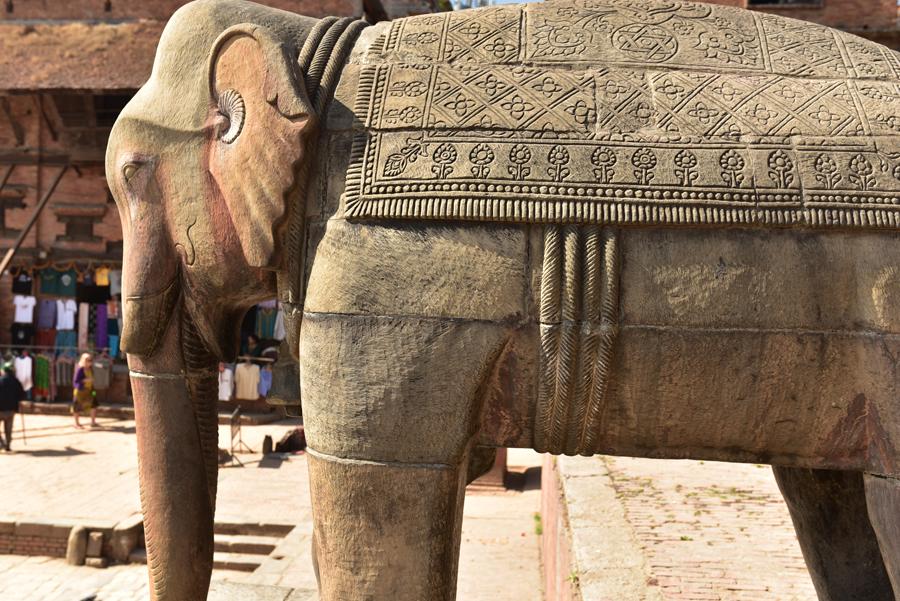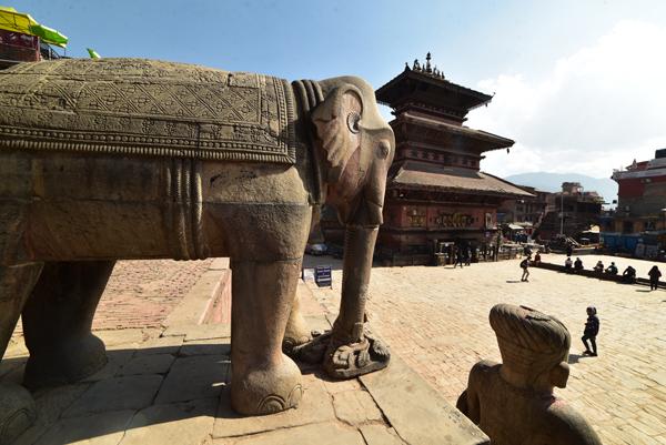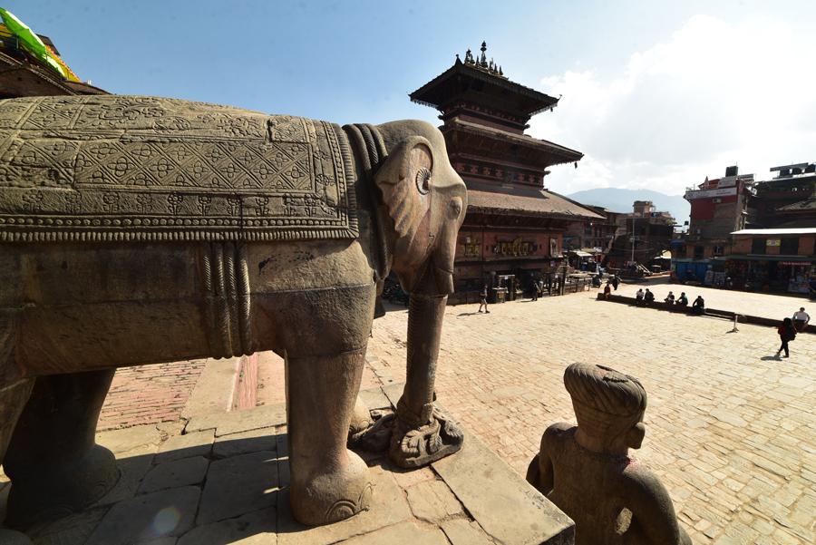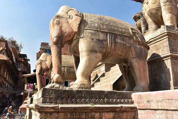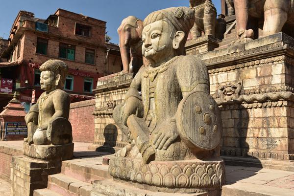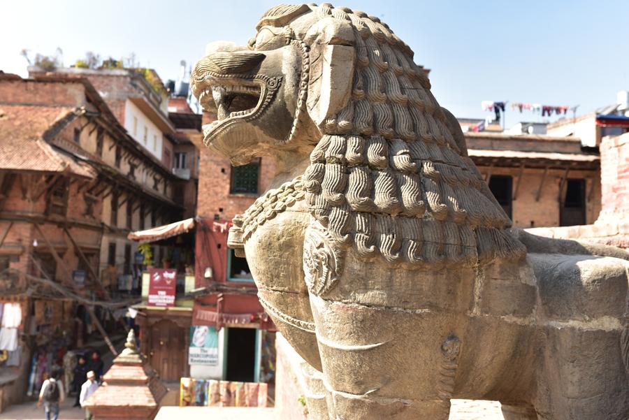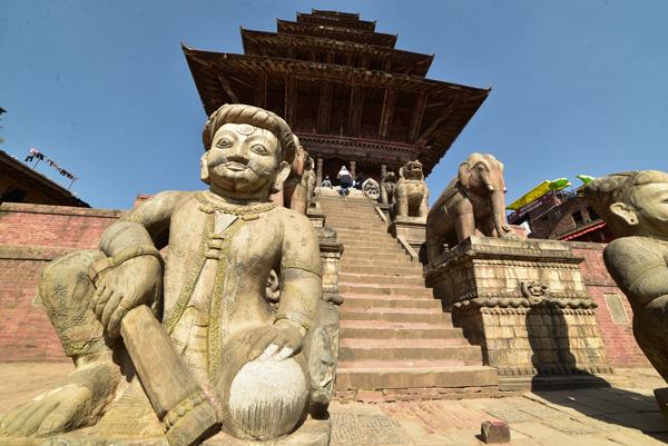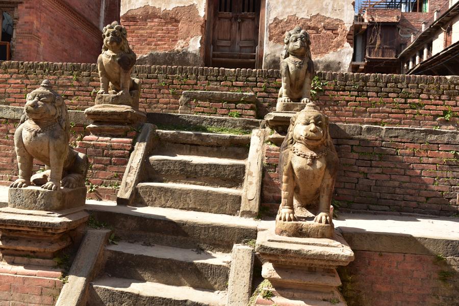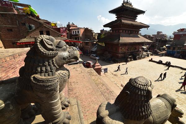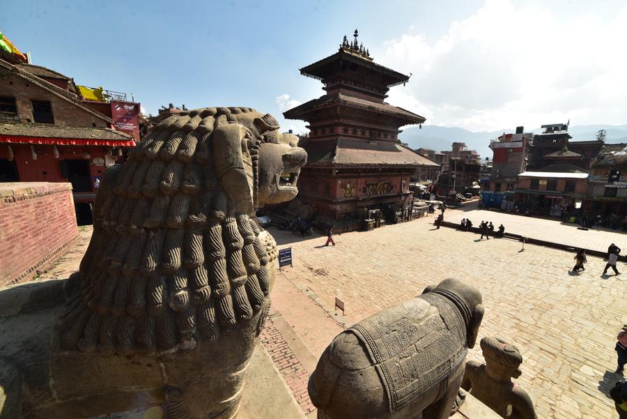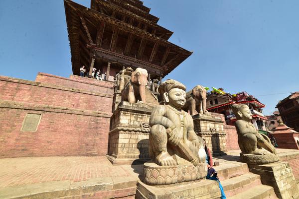 Griffons au premier plan. La vue depuis le sommet offre des perspectives fantastiques. Le temple de Nyatapola repose sur un socle à cinq niveaux flanqué à chacun de ses coins par quatre sanctuaires de Ganesh, le dieu éléphant.