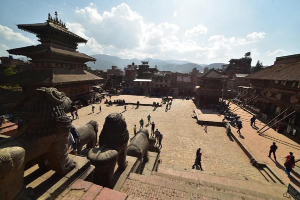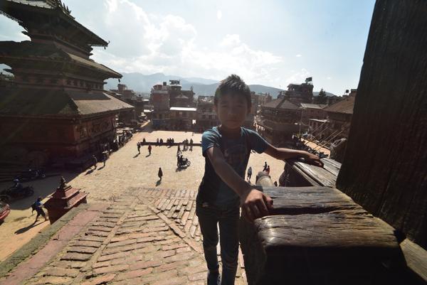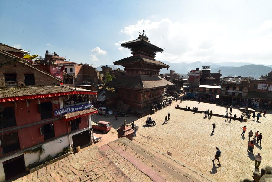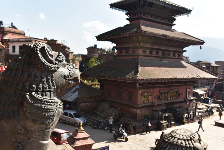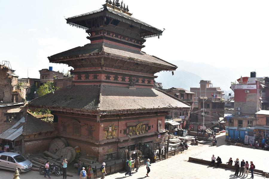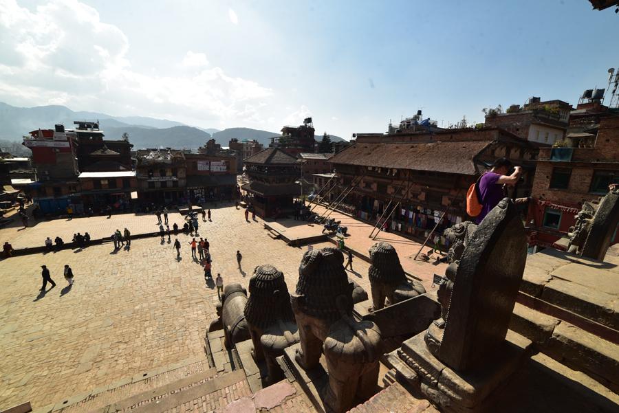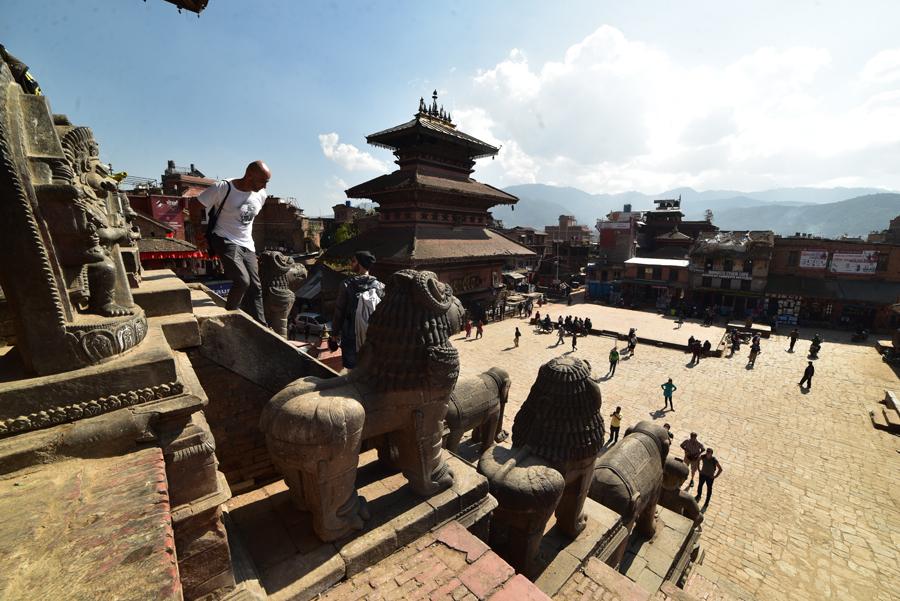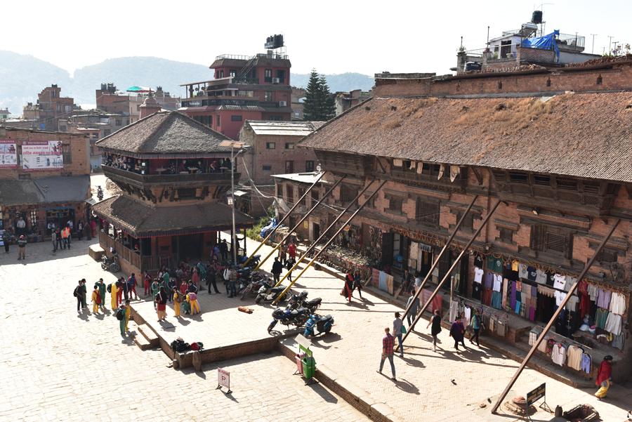 Le temple de Nyatapola est connu pour être le plus haut de tout le Népal. Depuis son sommet, on a une vue panoramique sur toute la place Taumadhi. En observant les façades, on distingue clairement les étais qui soutiennent toutes les maisons de la place. Le tremblement de terre de 2015 est encore dans toutes les têtes.
