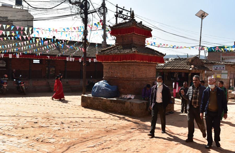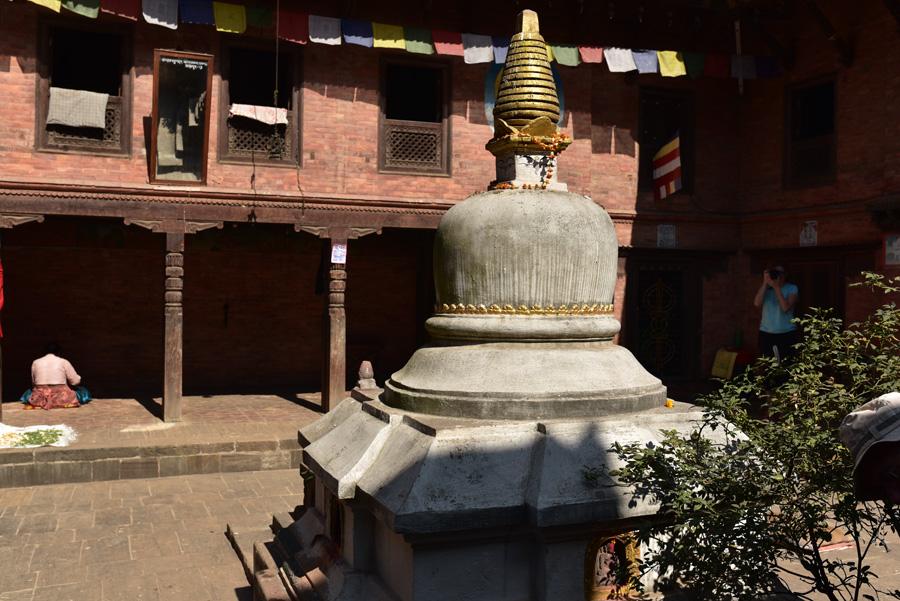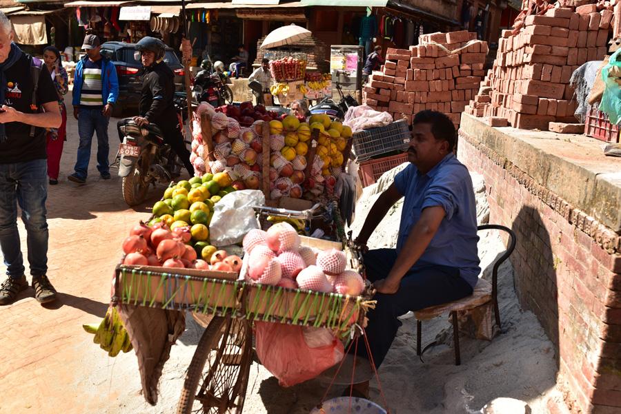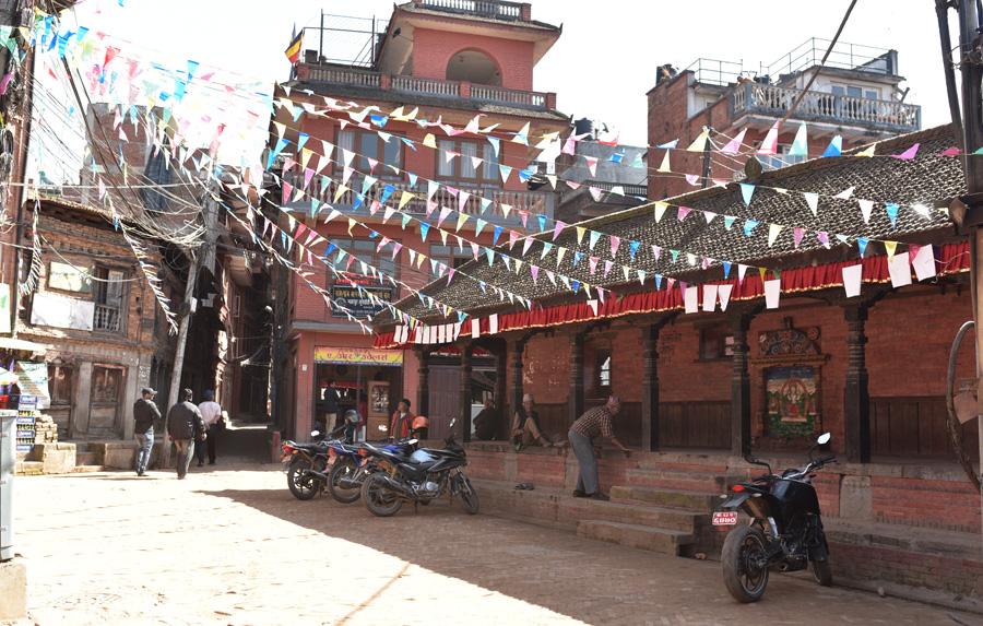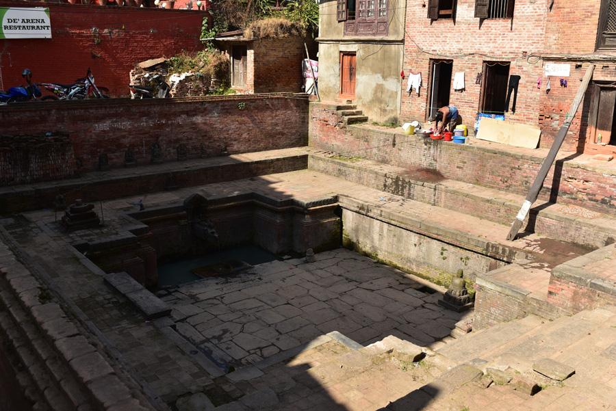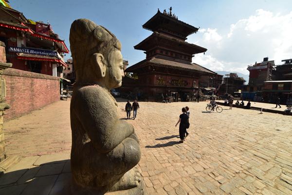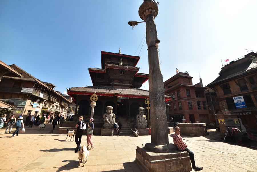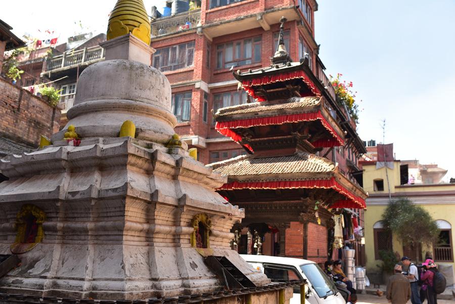Le temple de Nyatapola est connu pour être le plus haut de tout le Népal. Depuis son sommet, on a une vue panoramique sur toute la place Taumadhi. En observant les façades, on distingue clairement les étais qui soutiennent toutes les maisons de la place. Le tremblement de terre de 2015 est encore dans toutes les têtes.