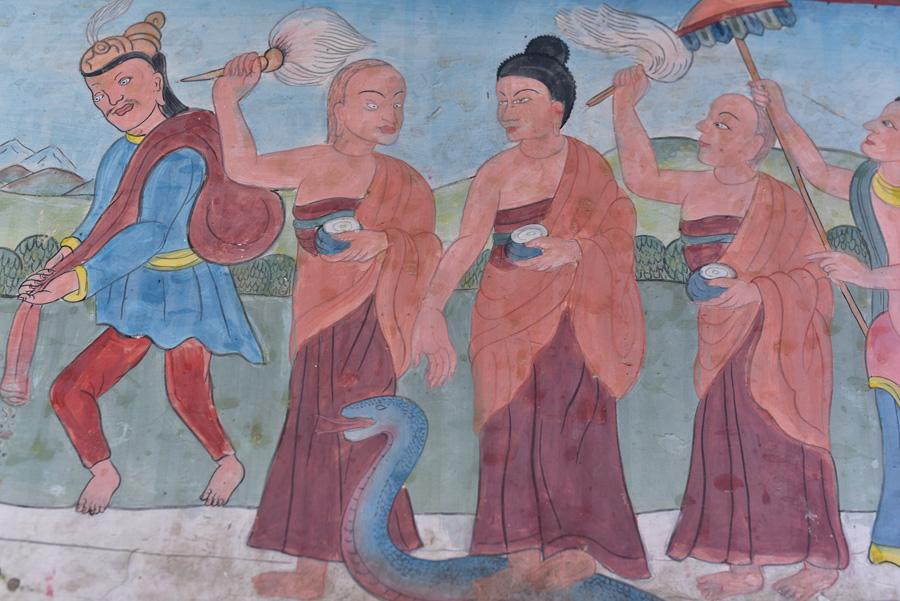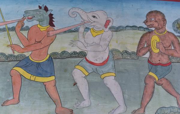 Sur un mur d’un temple, j’en profite pour admirer quelques scènes mythologiques. Hommes à tête de cheval et d’éléphant jouent de la flûte.