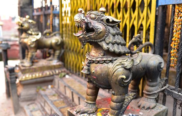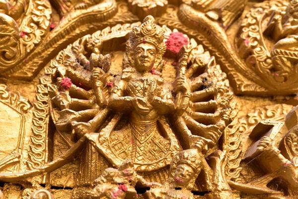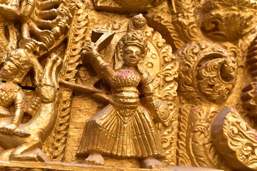 Au centre du temple se dresse une petite pagode à deux toits ornée de lions rugissants aux attributs plus que virils ! Sur le chapiteau doré, Vishnu n’en finit pas de se démultiplier. D’autres figures divines adoptent des positions guerrières et agressives.