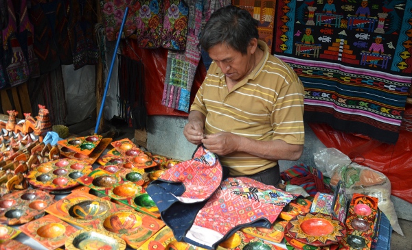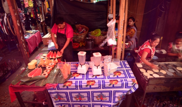 On trouve vraiment de tout ici : des couvertures, des huipiles brodés, des bijoux, des colliers, des articles de cuir, des masques, sans oublier les poteries ou les coffrets peints. C’est un spectacle incroyable qui se joue devant moi : les femmes de Chichi sont ornées de leurs plus beaux atours avec leur huipil à col, leurs broderies à dessins floraux et géométriques, leurs jupons à rayures bleues et à bandes horizontales.