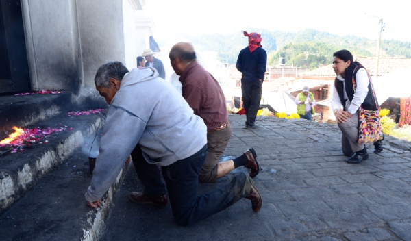 La cérémonie commence devant les portes de l’église Santo Tomas, où le prêtre maya adresse une prière à l’esprit qui règne en ce lieu et lui fait part de l’objet de sa visite. Elle se poursuit le plus souvent dans l’église même où brillent les chandelles allumées sur des pétales de fleurs arrosés d’eau de vie. Des offrandes encore.