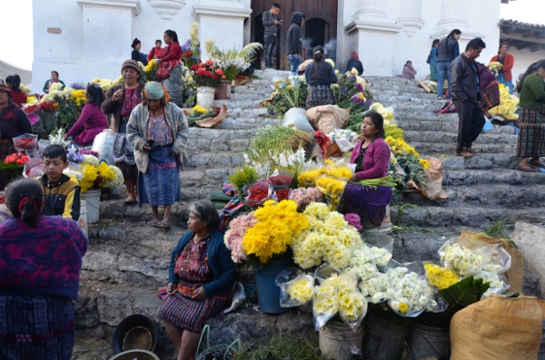 J’ai l’impression que ce voyage au Guatemala, en plein cœur de la civilisation maya, me fait aller de surprise en surprise, de beauté en beauté. Un long chemin vers l’essentiel qui me fait me dévêtir du superflu de notre monde globalisé. Et le plus bel exemple reste cet extraordinaire marché aux fleurs qui s’organise sur les marches du parvis de l’église. Et là encore, je préfère faire parler les images plutôt que les mots. J’en ai encore le souffle coupé. Quelle beauté. Quelle harmonie des couleurs.
