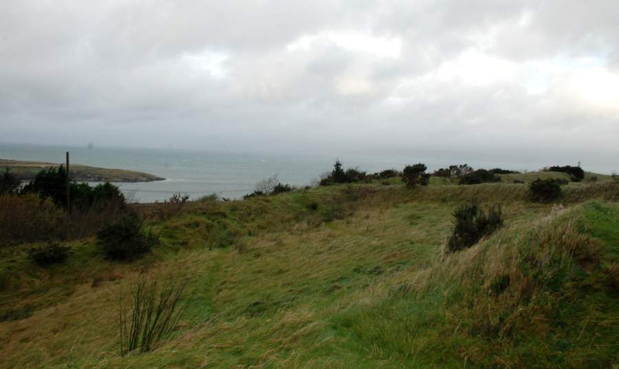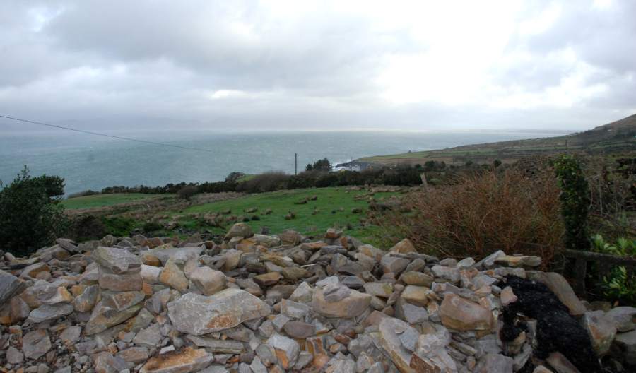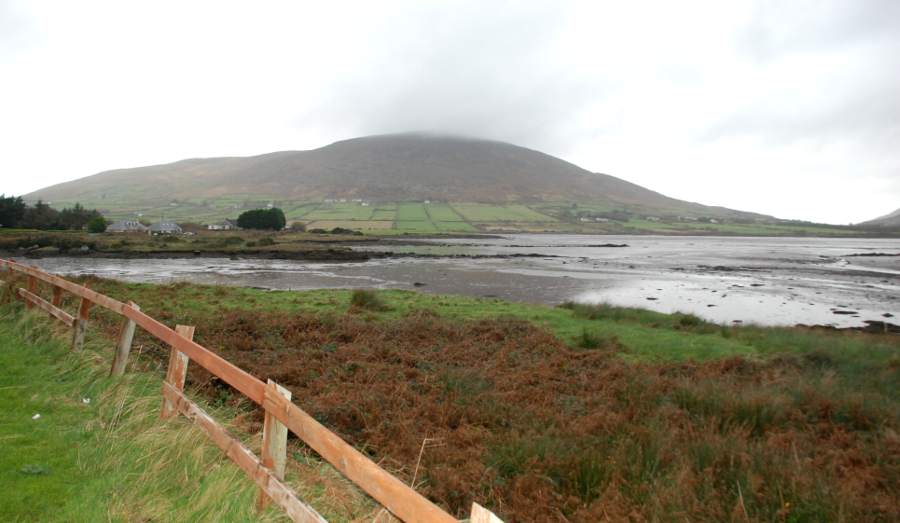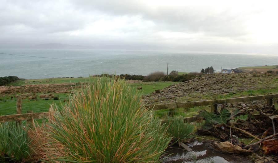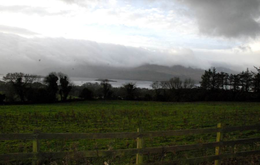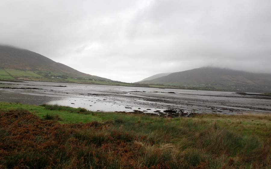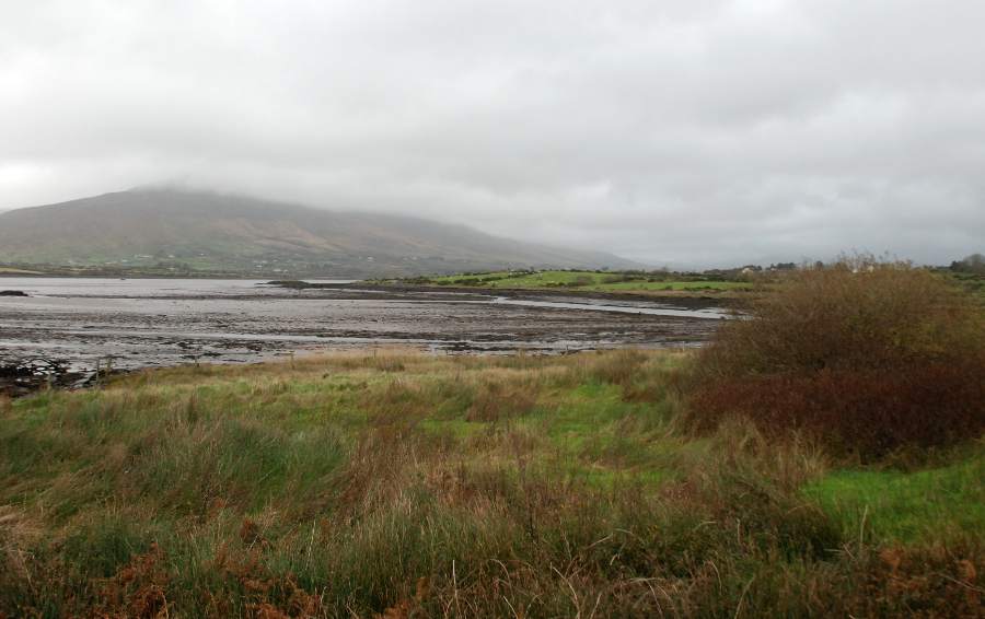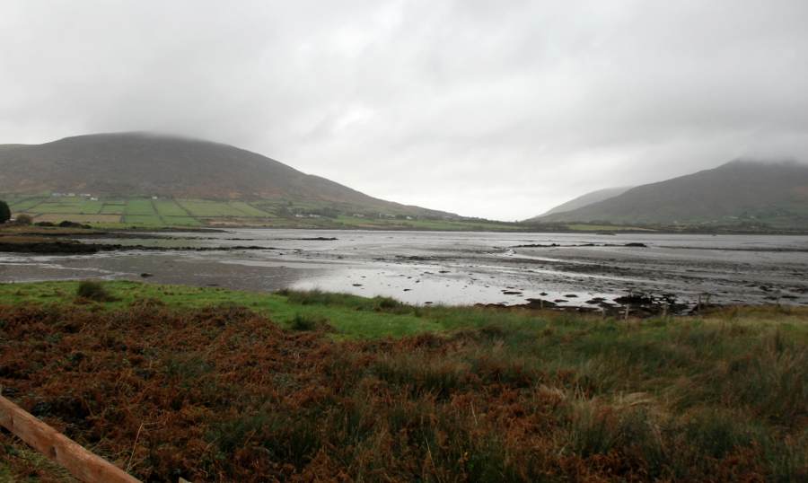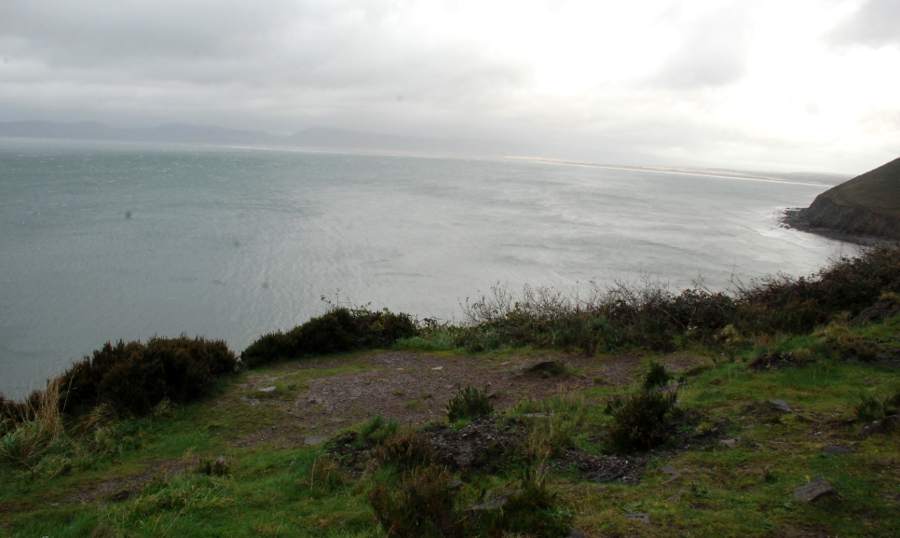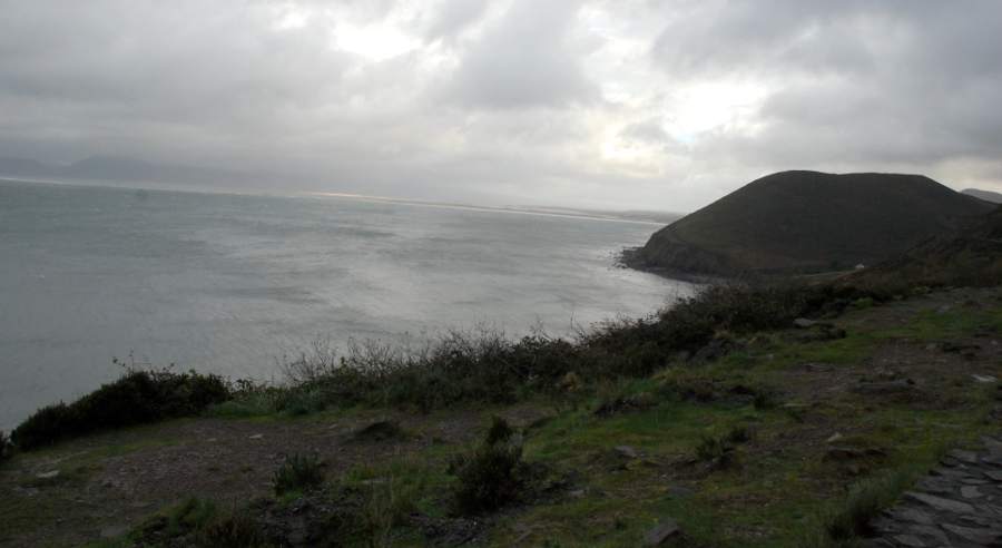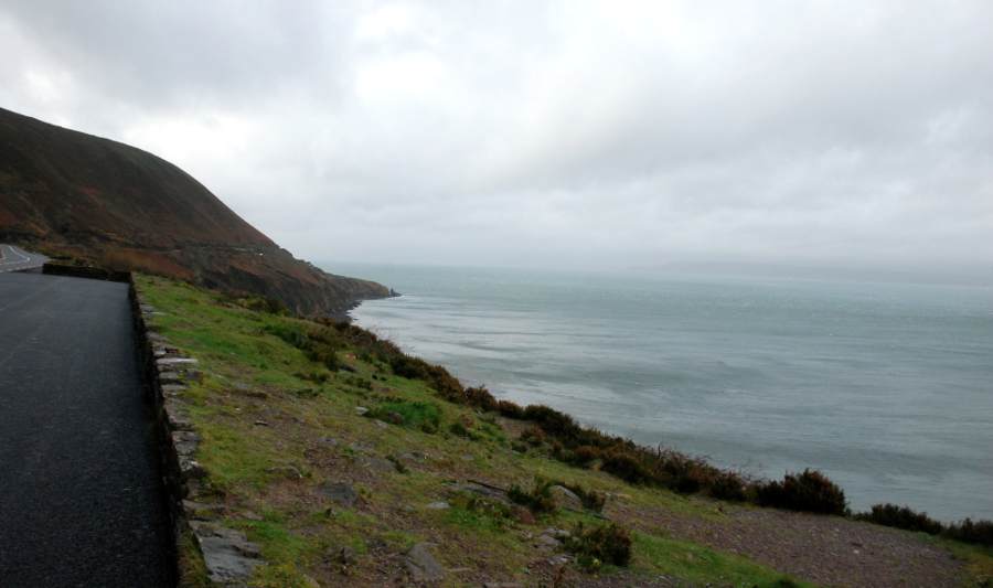 Après le gap, je file droit sur l’autre versant du Ring of Kerry, direction Keels et Cahirsiveen. La route longe d’abord le lough Caragh, puis s’élève et me mène sur une corniche qui domine les falaises et permet d’avoir une super vue sur la péninsule de Dingle. Dommage que le temps ne soit vraiment pas de la partie ! Du côté de Rossbeigh, le paysage s’élève soudain et forme une immense dune balayée par le vent. Superbe. La côte apparaît, découpée par les vagues et les déferlantes de l’Océan Atlantique. Les monts d’Irlande hérissés de sapins plongent dans l’océan. Au loin, on peut apercevoir la silhouette sombre des îles Valentia.