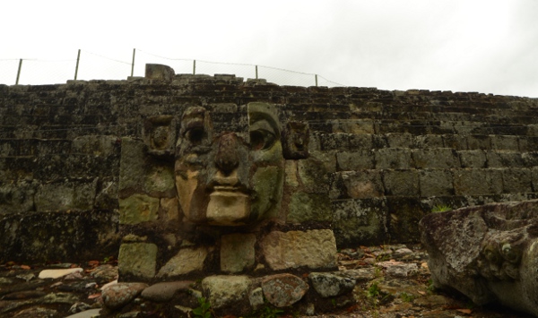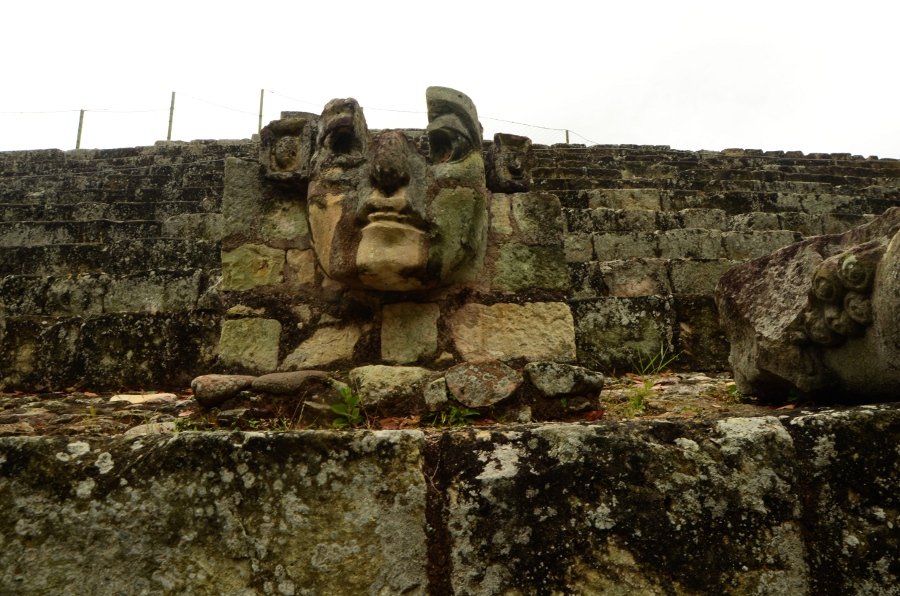 Il ne faut pas oublier de baisser les yeux (comme moi !) pour admirer l’extraordinaire mur de crânes qui orne l’entrée basse. Les têtes des souverains vaincus ? Ce temple est aussi appelé le Popol Nah ou Chambre du Conseil. Du côté occidental du Temple de 18 Lapins, de grandes nattes découpées dans la pierre formant une mosaïque décorent la partie haute des murs du bâtiment.