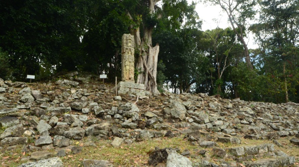 En relevant les yeux, sur le flanc de la colline qui borde Gran Plaza, à l’ouest, on aperçoit encore une autre stèle qui domine le site.