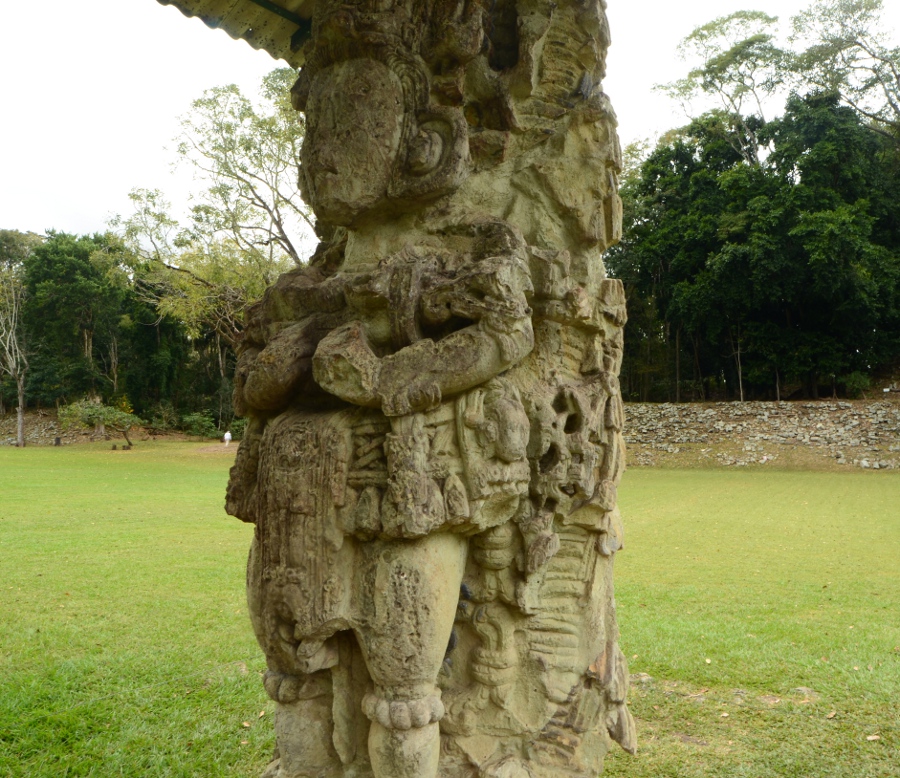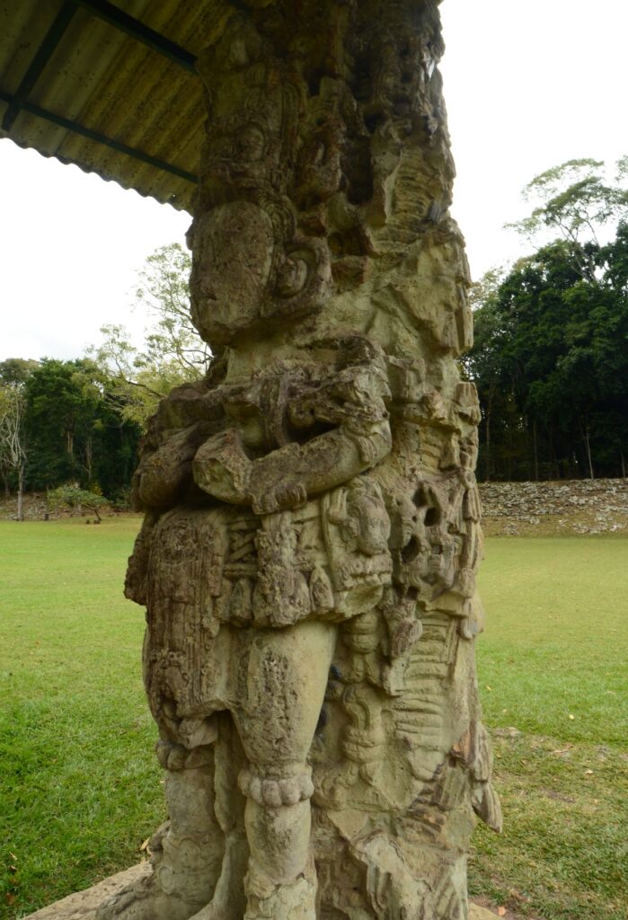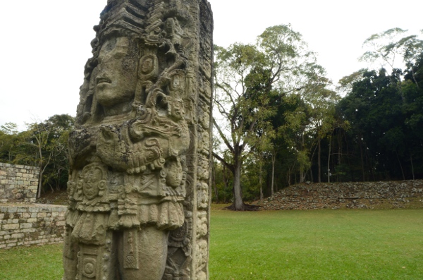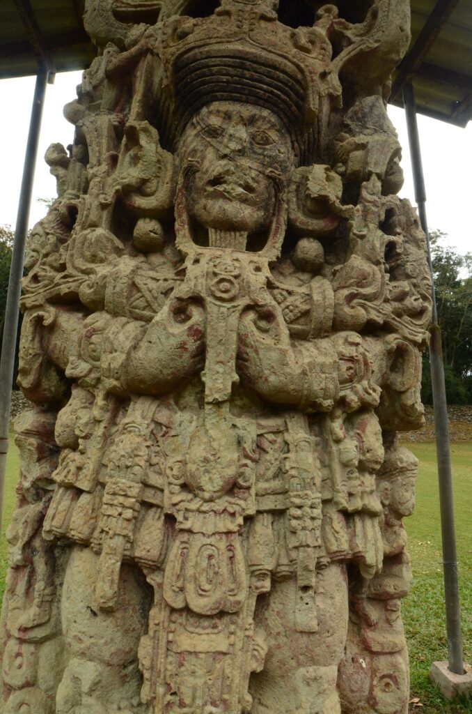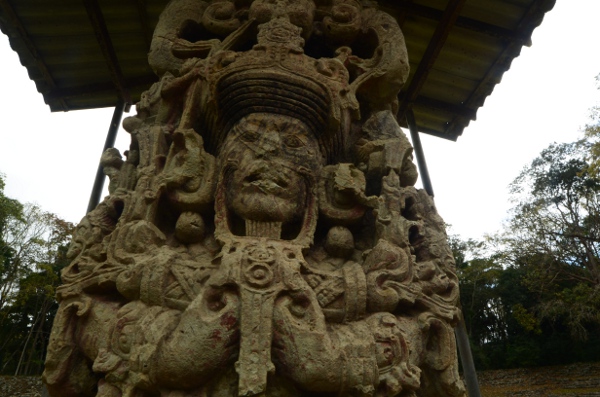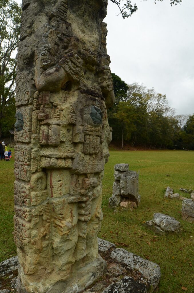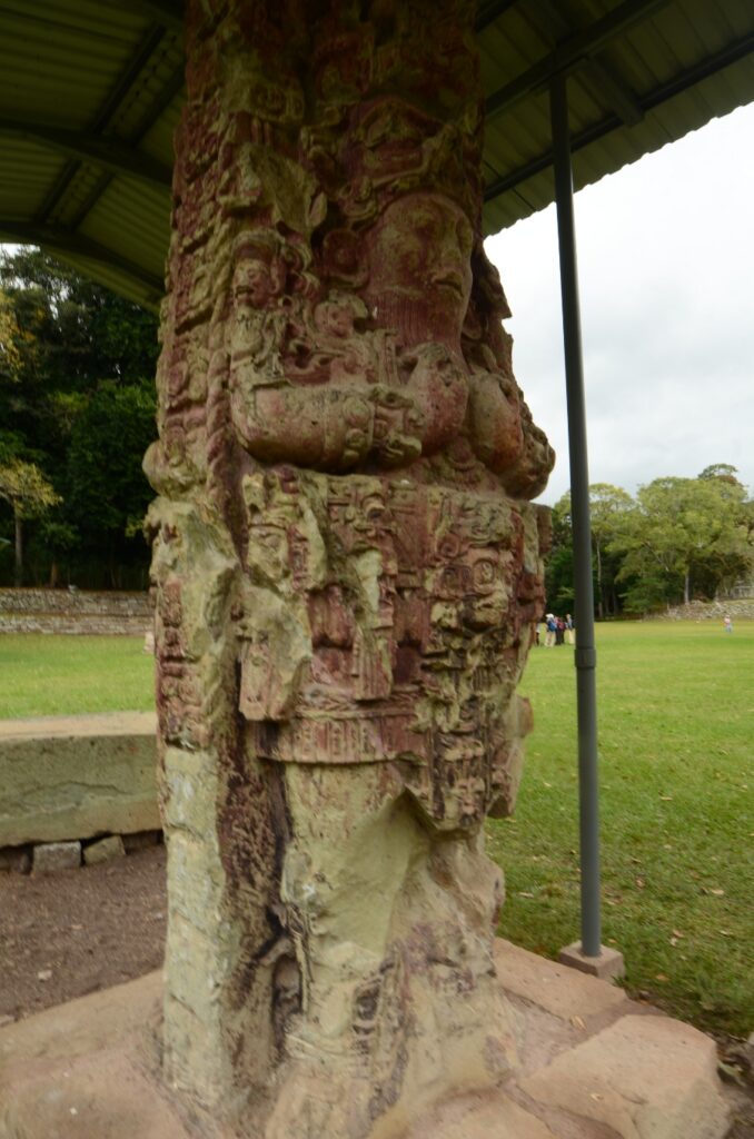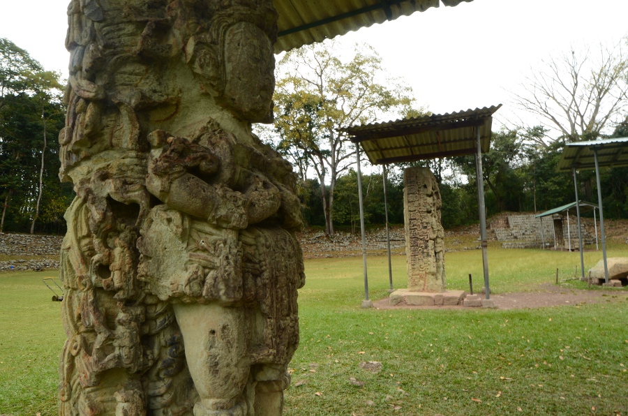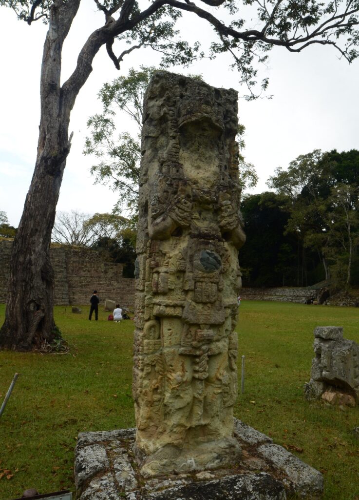 Son climat chaud et sec, au contraire de l’humidité du Chiapas et du Guatemala, a permis de conserver les stèles et de les préserver de l’érosion. Un comble, ma journée à Copán sera la seule où il fera gris et humide… Pas de chance ! Qu’importe, la ronde des stèles commence même avant que de rentrer officiellement sur le site. Sur le chemin pierré qui mène à l’entrée, on est arrêté par une première stèle monumentale : la stèle numéro 5.